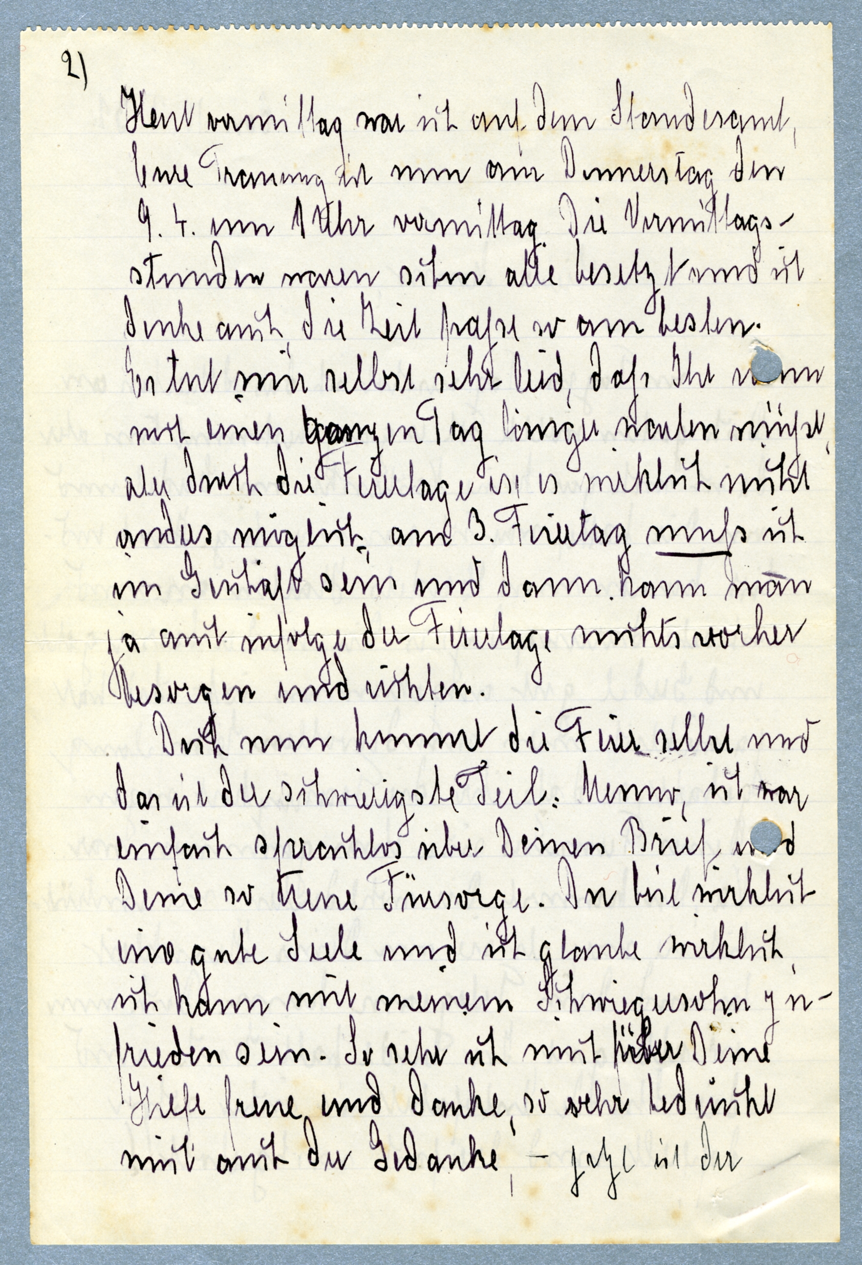 Heute vormittag war ich auf den Standesamt, Eure Trauung ist nun am Donnerstag den 9.4 um 1 Uhr vormittag. Die Vormittagstunden waren schon alle besetzt und ich denke auch, die Zeit passt so am besten. Es tut mir selbst sehr leid, dass Ihr [xxxx] noch[?] einen ganzen Tag langer warten müsst, aber durch die Freitage ist es wirklich nicht anders möglich am 3. Freitag muss ich im Geschaft sein und dann kann man ja auch infolge der Freitage[?] nichts vorher besorgen und [xxxx].