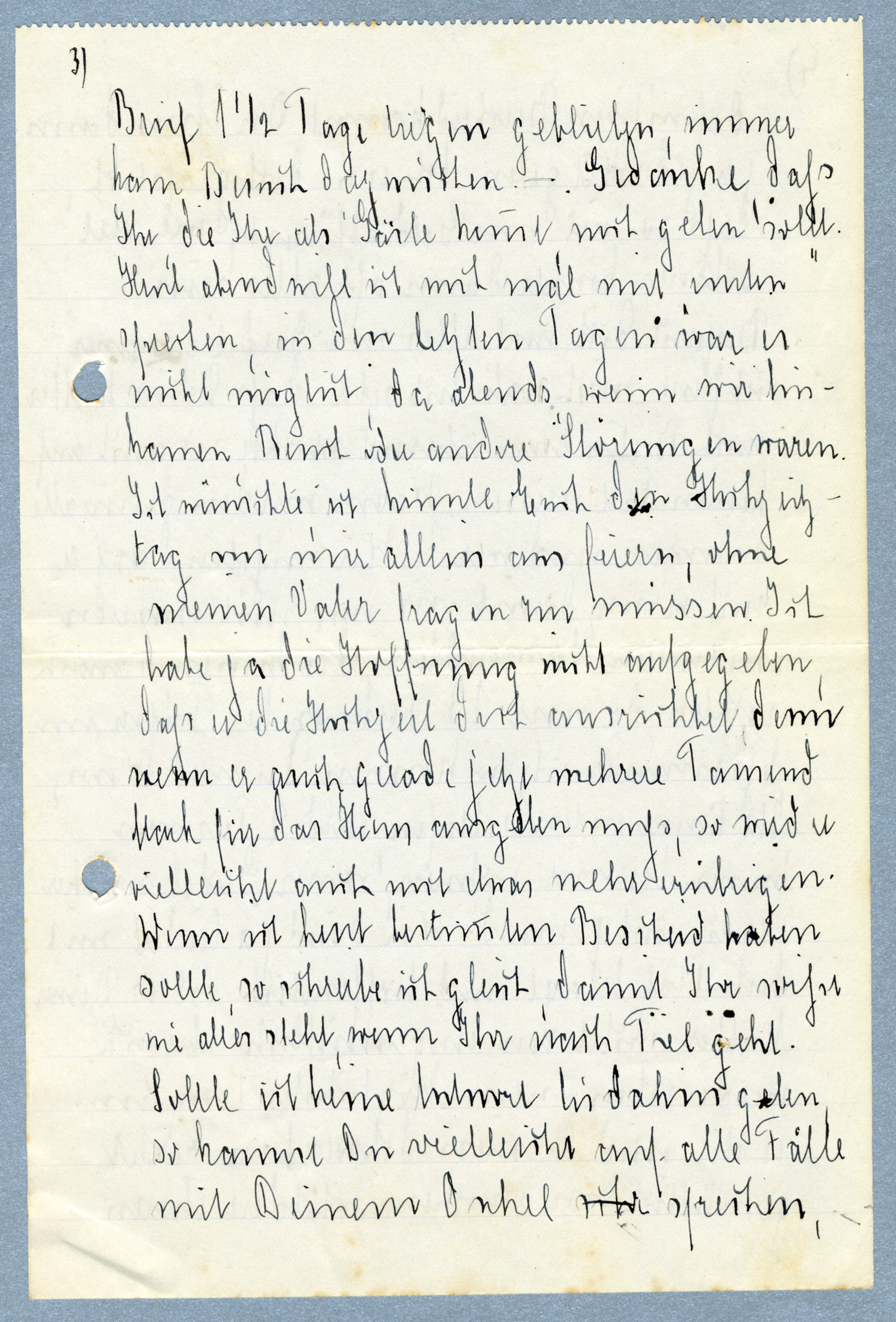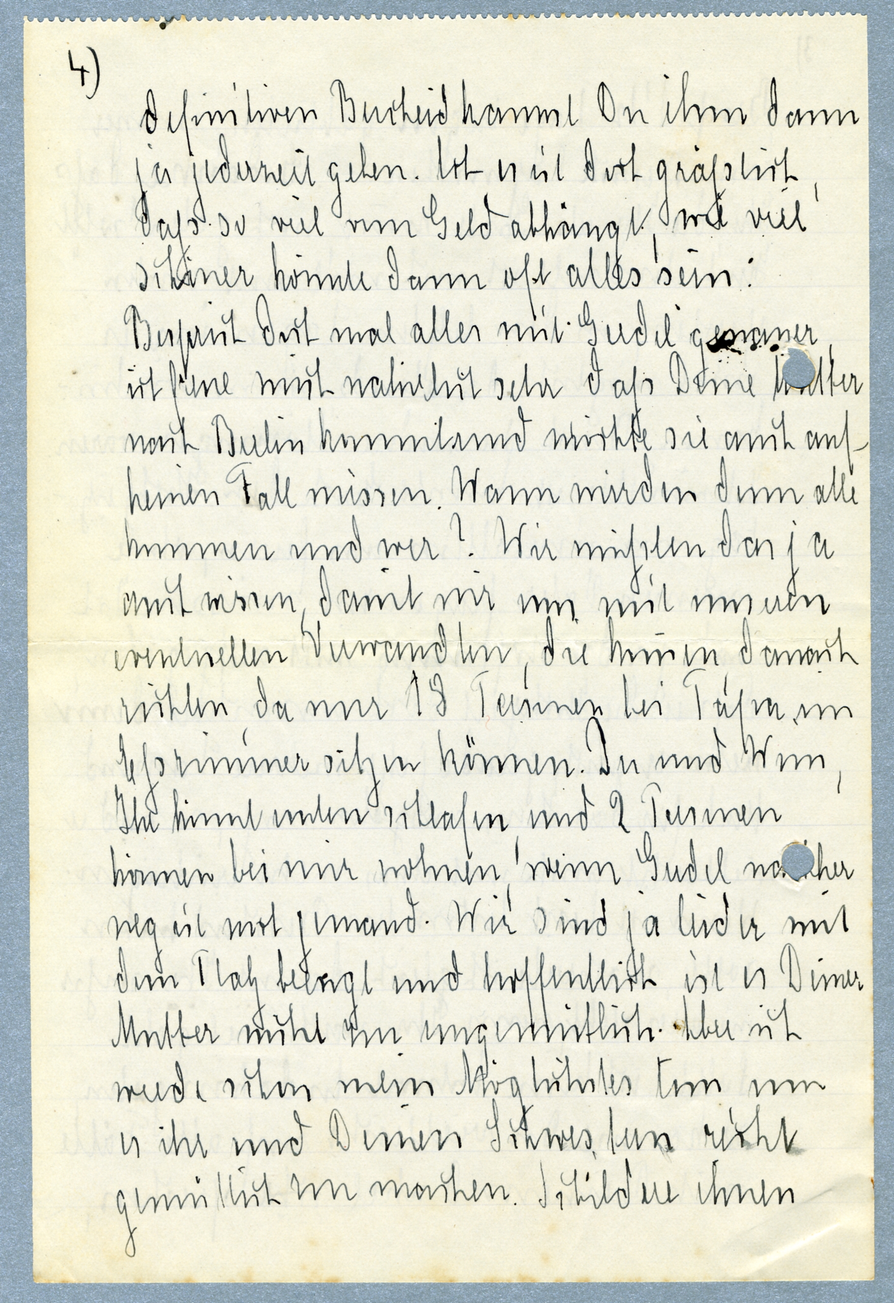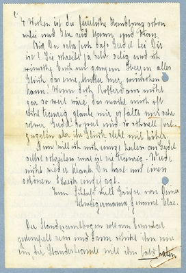 Doch nun kommt die Feier selbst und das ist das schwierigste Teil: Menno, ich war einfach sprachlos über Deinen Brief, und Deine so [treue] Fürsorge. Du bist wirklich eine gute Seele und ich glaube wirklich, ich kann mit meinem Schiegersohn zufrieden sein. So sehr ich mich über Deine Hilfe frohe und danke, so sehr bedrückt mich auch die Gedanke, - jetzt ist der Brief 1 ½ tage liegen geblieben, immer kam [xxx] dazwischen.- Gedanke dass Ihr die ihr als [xxx] [xxx] geben sollst. Heute abend muss ich noch mal mit [xxx] sprechen, in den letzten Tagen war es nicht möglich, da abends wenn wir hinkamen, [xxx] oder andere Störungen waren. Ich wünschte ich konnte Euch den Hochzeitstag von mir allein aus feiern, ohne meinen Vater fragen zur mussen. Ich habe ja die Hoffnung nicht aufgegeben dass er die Hochzeit [xxx]ausrichtet denn wenn er [xx] gerade jetzt mehrere Tausend Mark für das Haus ausgeben muss, so wird er vielleicht auch noch etwas mehr [xxx]. Wenn ich heute bestimmten Bescheid haben solle, so schreibe ich gleich, damit Ihr sofort [xx] alles steht, wenn Ihr nach Tiel geht. Sollte ich keine Antwort bis dahin geben so kannst Du vielleicht auf alle Fälle mit Deinem Onkel sprechen, definitiven Bescheid kannst Du ihm dann ja jederzeit geben. [xx] es ist doch grässlich, dass so viel vom Geld abhängt, wie viel [xxx] konte dann oft ale sein.