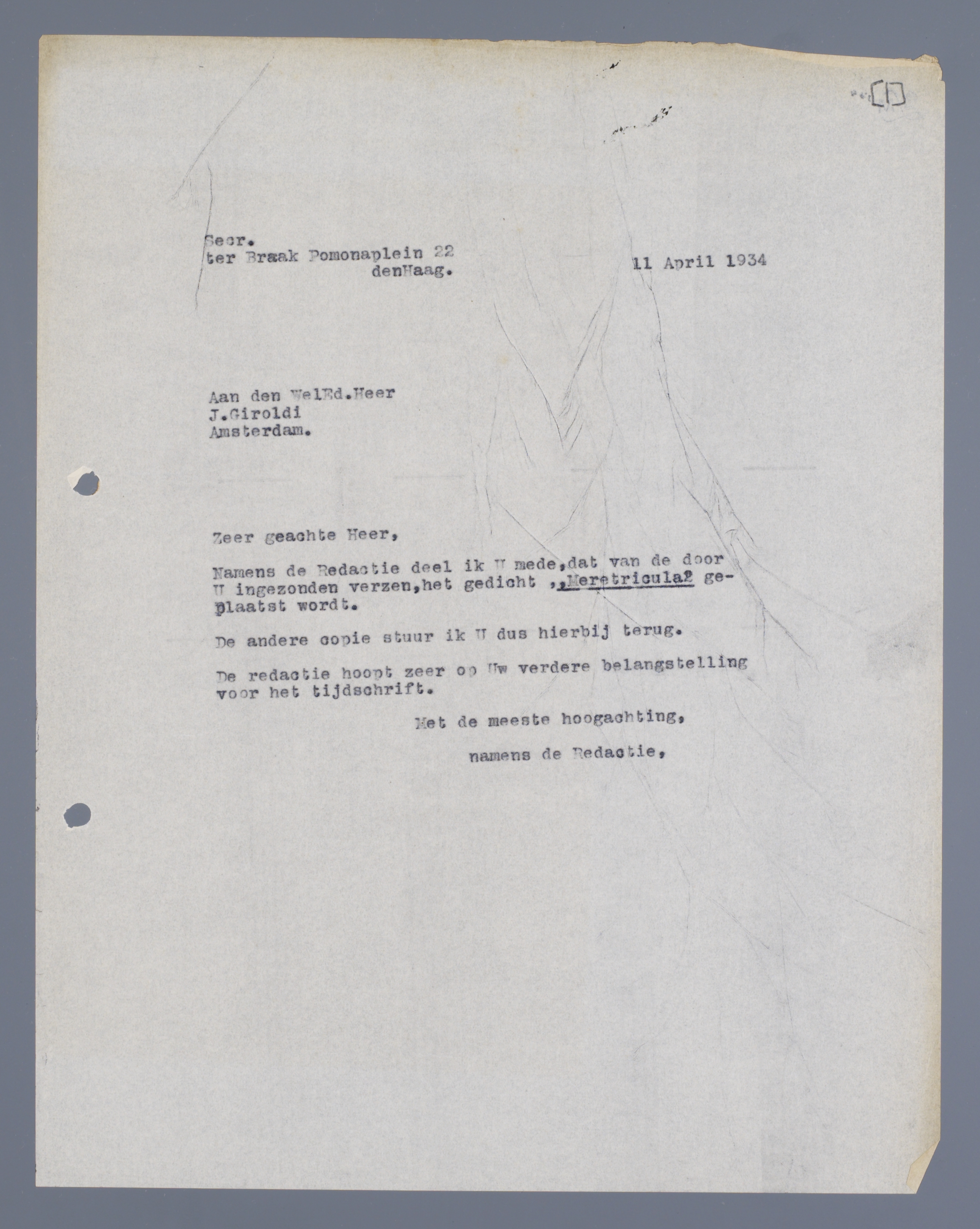 Namens de Redactie deel ik U mede, dat van de door U ingezonden verzen, het gedicht ‘Meretricula’ geplaatst wordt.