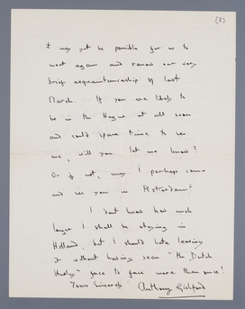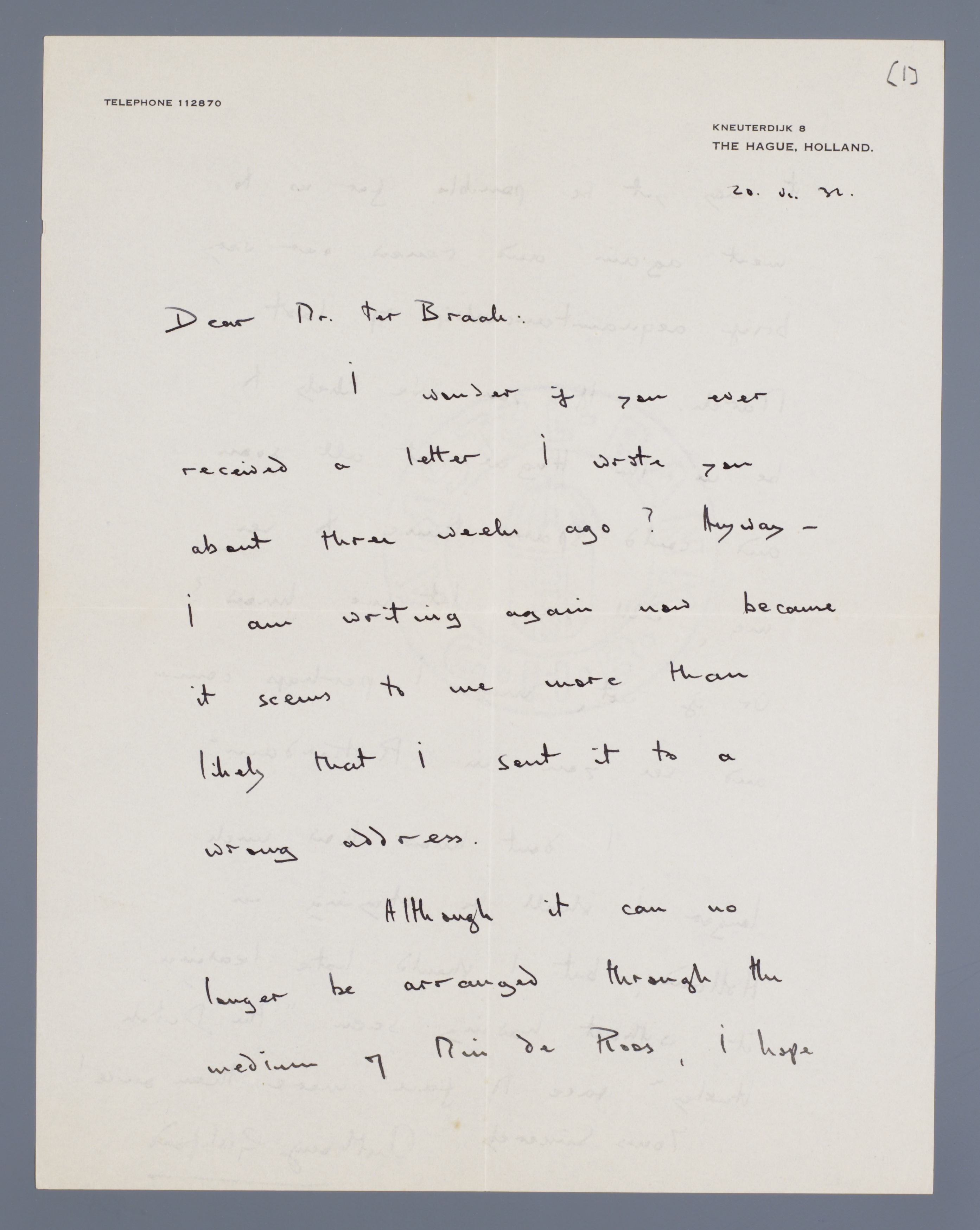 Although it can no longer be arranged through the medium of Miss. de Roos, I hope it may yet be possible for us to meet again and renew our very brief acquaintanceship of last March. If you are likely to be in the Hague at all soon and could spare time to see me, will you let me know? Or if not, may I perhaps come and see you in Rotterdam?