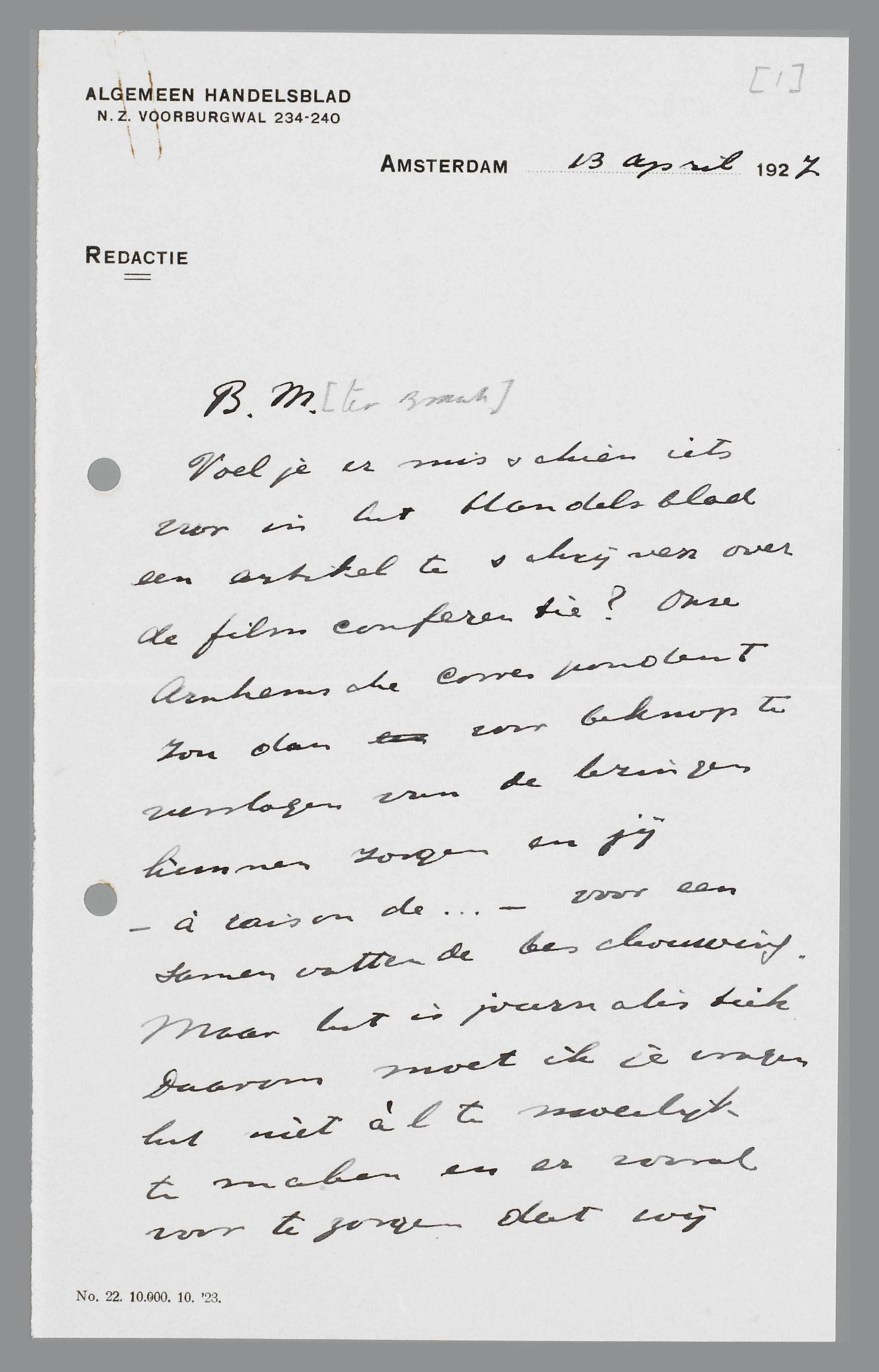 Voel je er misschien iets voor in het Handelsblad een artikel te schrijven over de film conferentie? Onze Arnhemsche correspondent zou dan voor beknopte verslagen van de lezingen kunnen zorgen en jij - à raison de... - voor een samenvattende beschouwing. Maar het is journalistiek. Daarom moet ik je vragen het niet àl te moeilijk te maken en er vooral voor te zorgen dat wij je bijdrage zoo spoedig mogelijk (liefst niet later dan één dag na de conferentie) kunnen plaatsen.