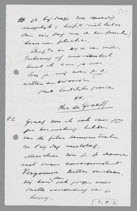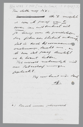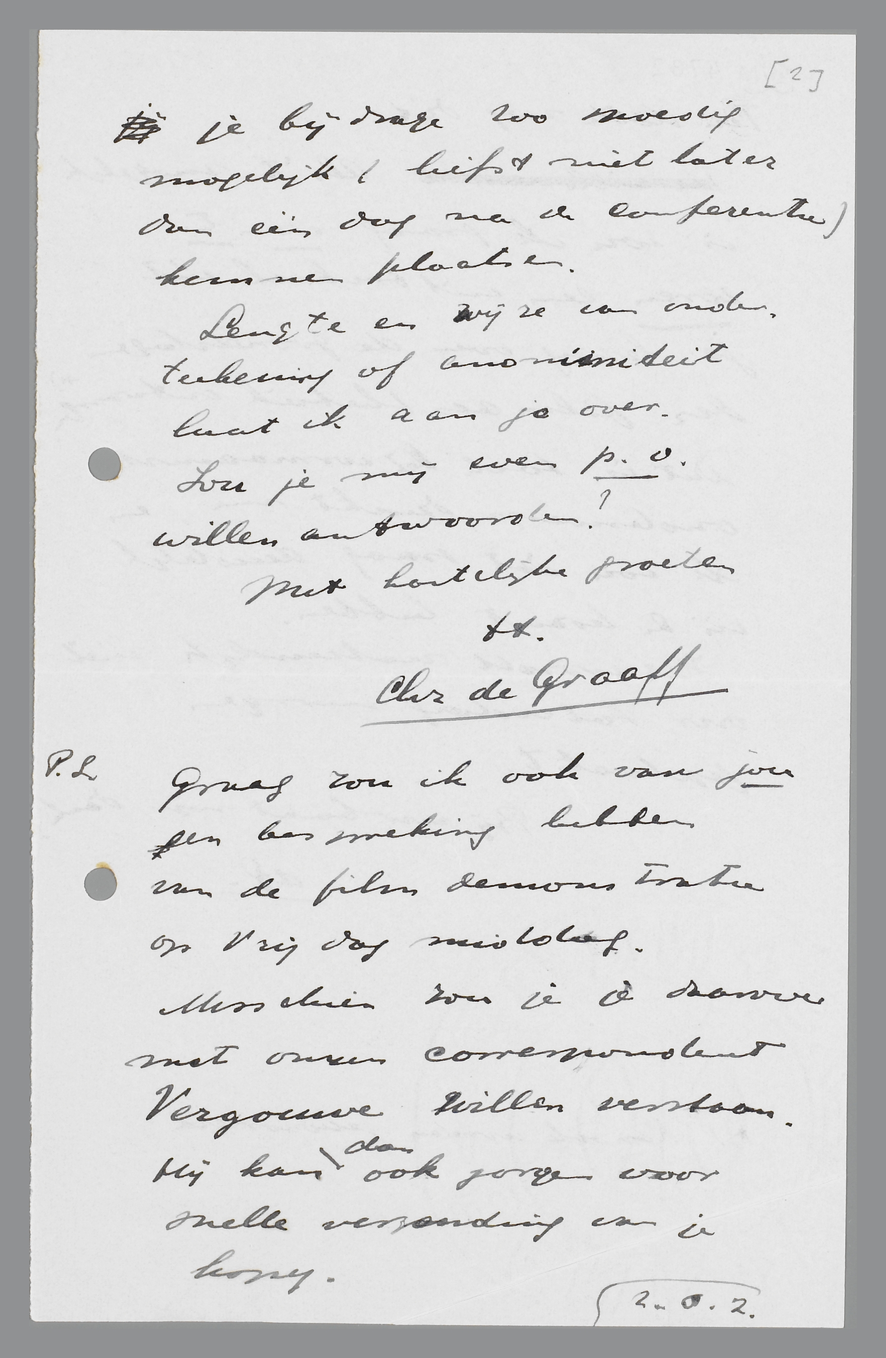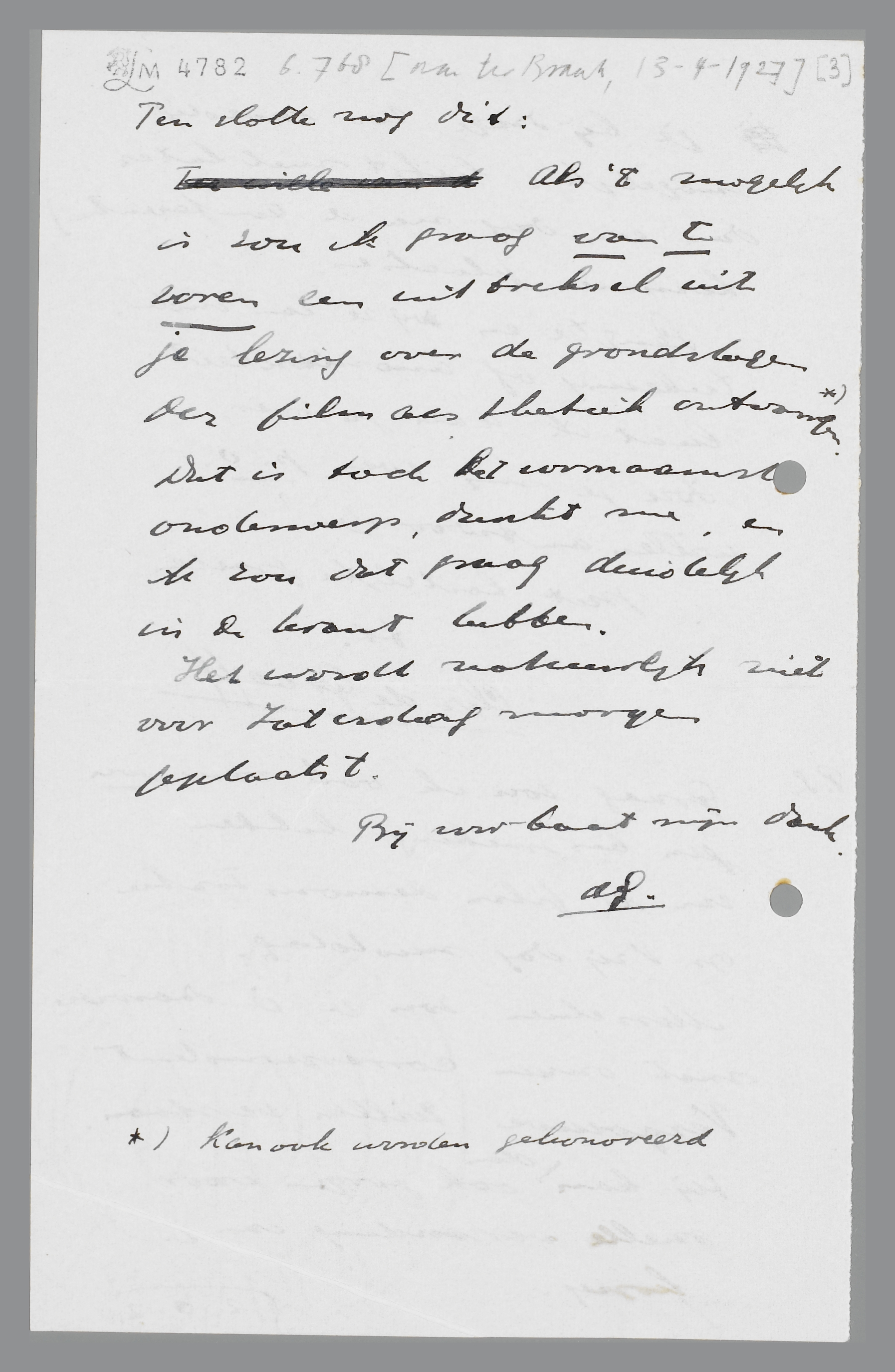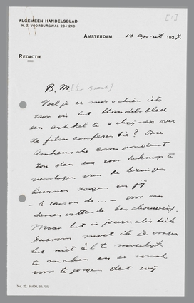 Als 't mogelijk is zou ik graag van te voren een uitreksel uit je lezing over de grondslagen der filmaesthetiek ontvangen. (Kan ook worden gehonoreerd.) Dat is toch het voornaamste onderwerp, dunkt me, en ik zou dat graag duidelijk in de krant hebben.