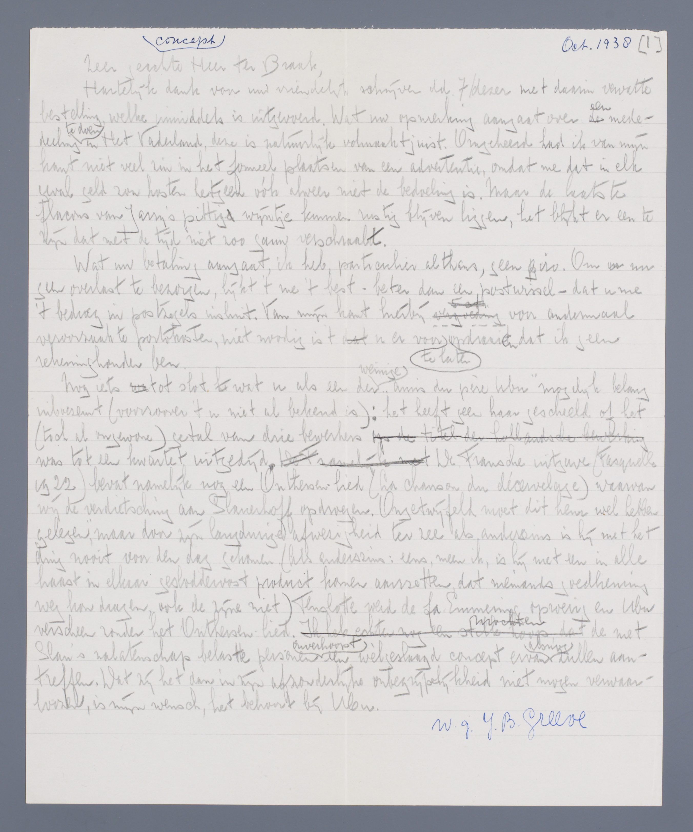 Wat uw betaling aangaat, ik heb, particulier althans, geen giro. Om u nu geen overlast te bezorgen, lijkt 't me 't best - beter dan een postwissel - dat u me 't bedrag in postzegels insluit. Van mijn kant hierbij [vergoeding] voor andermaal veroorzaakte portokosten, niet noodig is 't u er voor te laten opdraaien dat ik geen rekeninghouder ben.