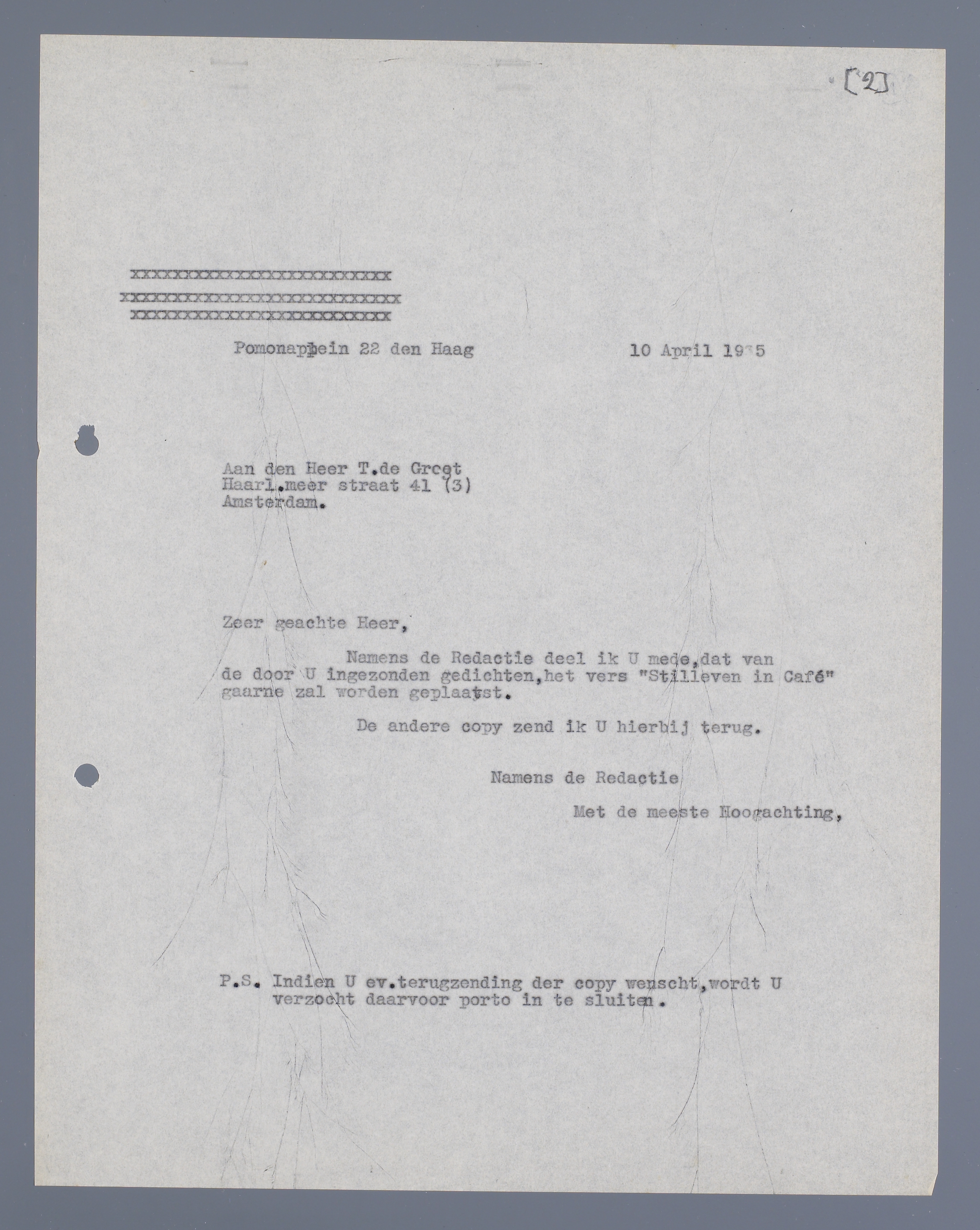 Namens de Redactie deel ik U mede, dat van de door U ingezonden gedichten, het vers ‘Stilleven in Café’ gaarne zal worden geplaatst.