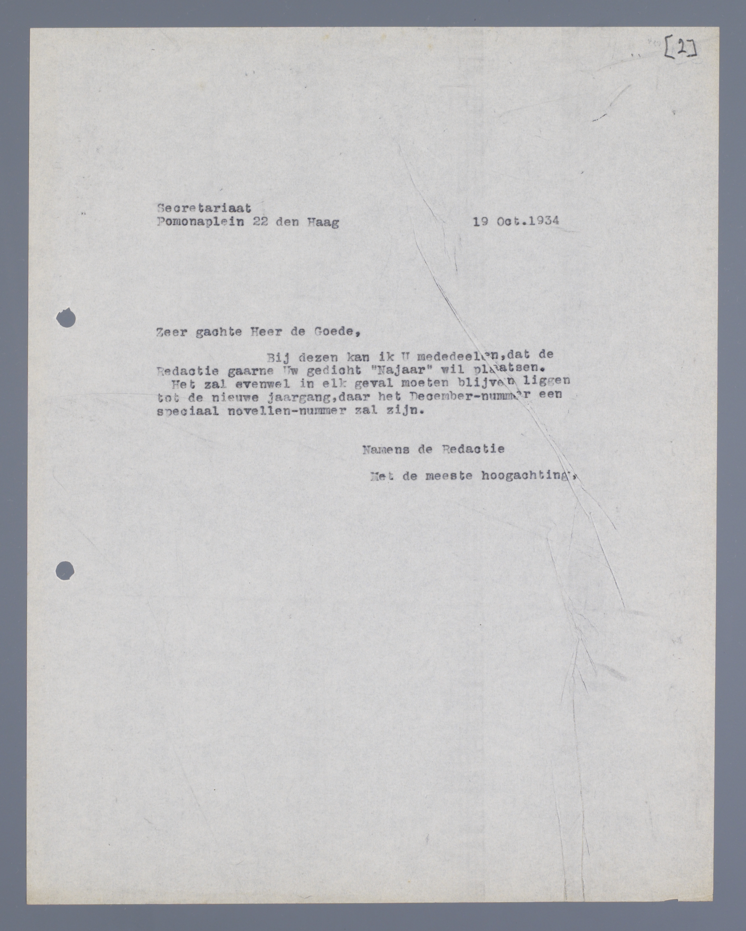 Bij dezen kan ik U mededeelen, dat de Redactie gaarne Uw gedicht ‘Najaar’ wil plaatsen.
