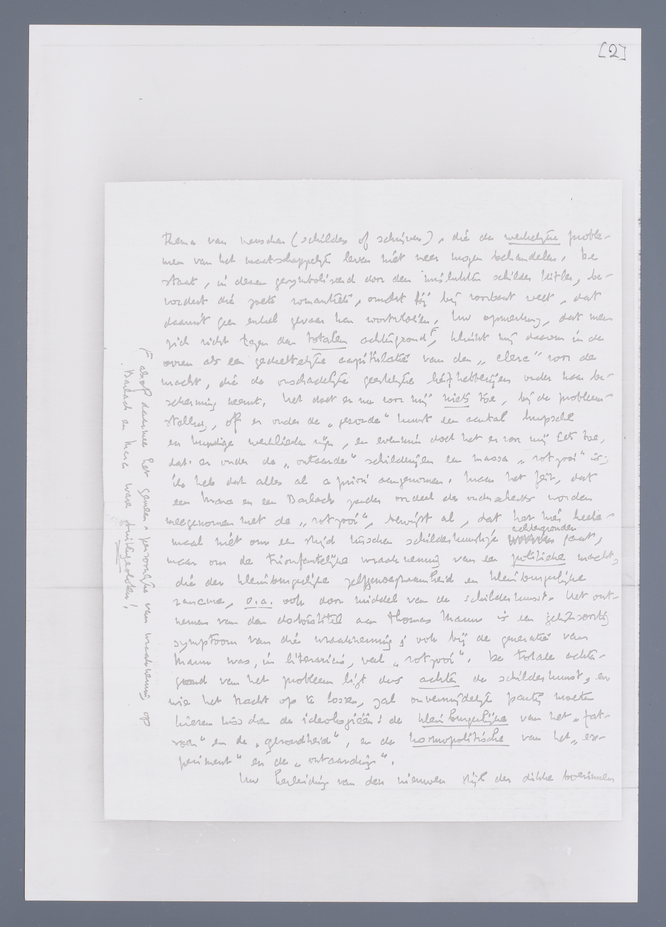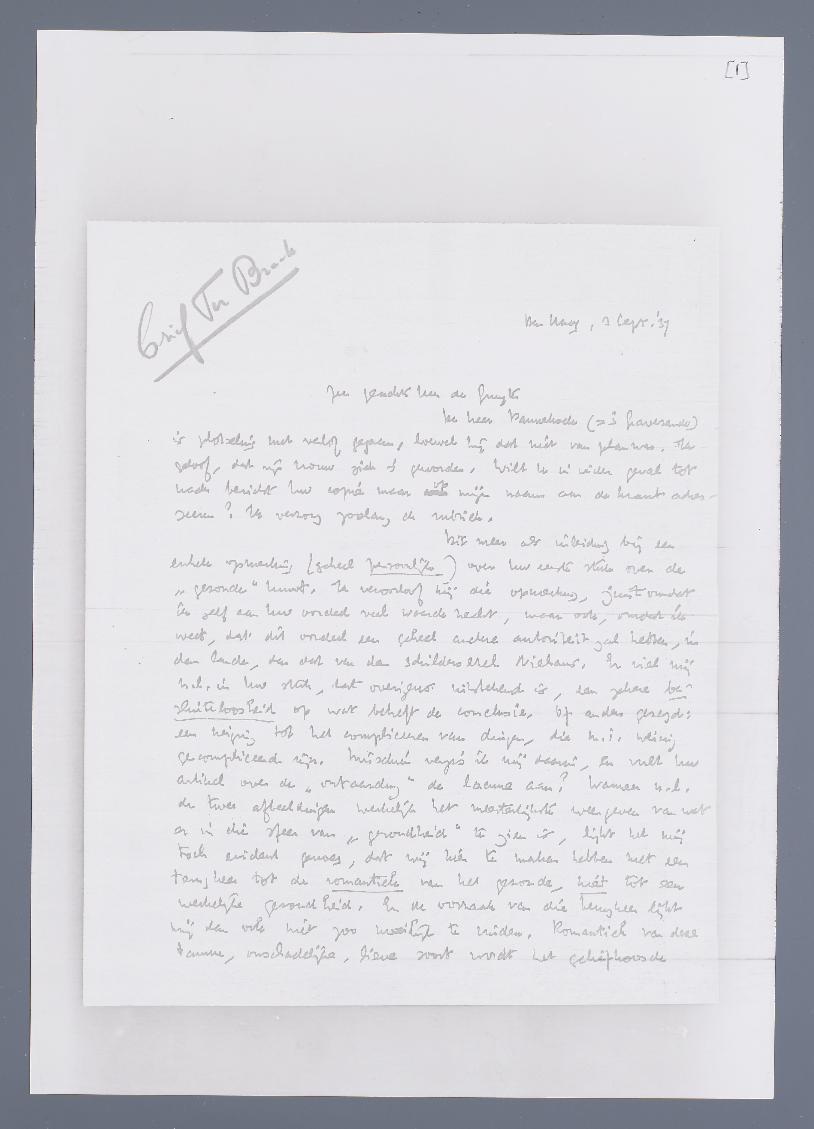 Dit meer als inleiding bij een enkele opmerking (geheel persoonlijk) over Uw eerste stuk over de ‘gezonde’ kunst. Ik veroorloof mij die opmerking, juist omdat ik zelf aan Uw oordeel veel waarde hecht, maar ook, omdat ik weet, dat dit oordeel een geheel andere autoriteit zal hebben, in den lande, dan dat van den schildersezel Niehaus. Er viel mij n.l. in Uw stuk, dat overigens uitstekend is, een zekere besluiteloosheid op wat betreft de conclusie. Of anders gezegd: een neiging tot het compliceeren van dingen, die m.i. weinig gecompliceerd zijn. Misschien vergis ik mij daarin, en vult Uw artikel over de ‘ontaarding’ de lacune aan? Wanneer n.l. de twee afbeeldingen werkelijk het meesterlijkste weergeven van wat er in die sfeer van ‘gezondheid’ te zien is, lijkt het mij toch evident genoeg, dat wij hier te maken hebben met een terugkeer tot de romantiek van het gezonde, niet tot een werkelijke gezondheid. En de oorzaak van die terugkeer lijkt mij dan ook niet zoo moeilijk te vinden. Romantiek van deze tamme, onschadelijke, lieve soort wordt het geliefkoosde thema van menschen (schilders of schrijvers), die de werkelijke problemen van het maatschappelijk leven niet meer mogen behandelen. De staat, in dezen gesymboliseerd door den mislukten schilder Hitler, bevordert die zoete romantiek, omdat hij bij voorbaat weet, dat daaruit geen enkel gevaar kan voortvloeien. Uw opmerking, dat men zich richt tegen den totalen achtergrond, alsof daarmee het gemeen-persoonlijke van wraakneming op Barlach en Marc ware buitengesloten!, klinkt mij daarom in de ooren als een gedeeltelijke capitulatie van den ‘clerc’ voor de macht, die de onschadelijke geestelijke liefhebberijen onder haar bescherming neemt. Het doet er nu voor mij niets toe, bij de probleemstelling, of er onder de ‘gezonde’ kunst een aantal hupsche en kundige werklieden zijn, en evenmin doet het er voor mij iets toe, dat er onder de ‘ontaarde’ schilderijen een massa ‘rotzooi’ is; ik heb dat alles al a priori aangenomen. Maar het feit, dat een Marc en een Barlach zonder oordeel des onderscheids worden meegenomen met de ‘rotzooi’, bewijst al, dat het hier heelemaal niet om een strijd tusschen schilderkunstige achtergronden gaat, maar om de triomfantelijke wraakneming van een politieke macht, die der kleinburgerlijke zelfgenoegzaamheid en kleinburgerlijke rancune, o.a. ook door middel van de schilderskunst. Het ontnemen van den doctorstitel aan Thomas Mann is een gelijksoortig symptoom van die wraakneming; ook bij de generatie van Mann was, in literaricis, veel ‘rotzooi’. De totale achtergrond van het probleem ligt dus achter de schilderskunst, en wie het tracht op te lossen, zal onvermijdelijk partij moeten kiezen tusschen de ideologieën: de kleinburgerlijke van het ‘fatsoen’ en de ‘gezondheid’, en de kosmopolitische van het ‘experiment’ en de ‘ontaarding’.