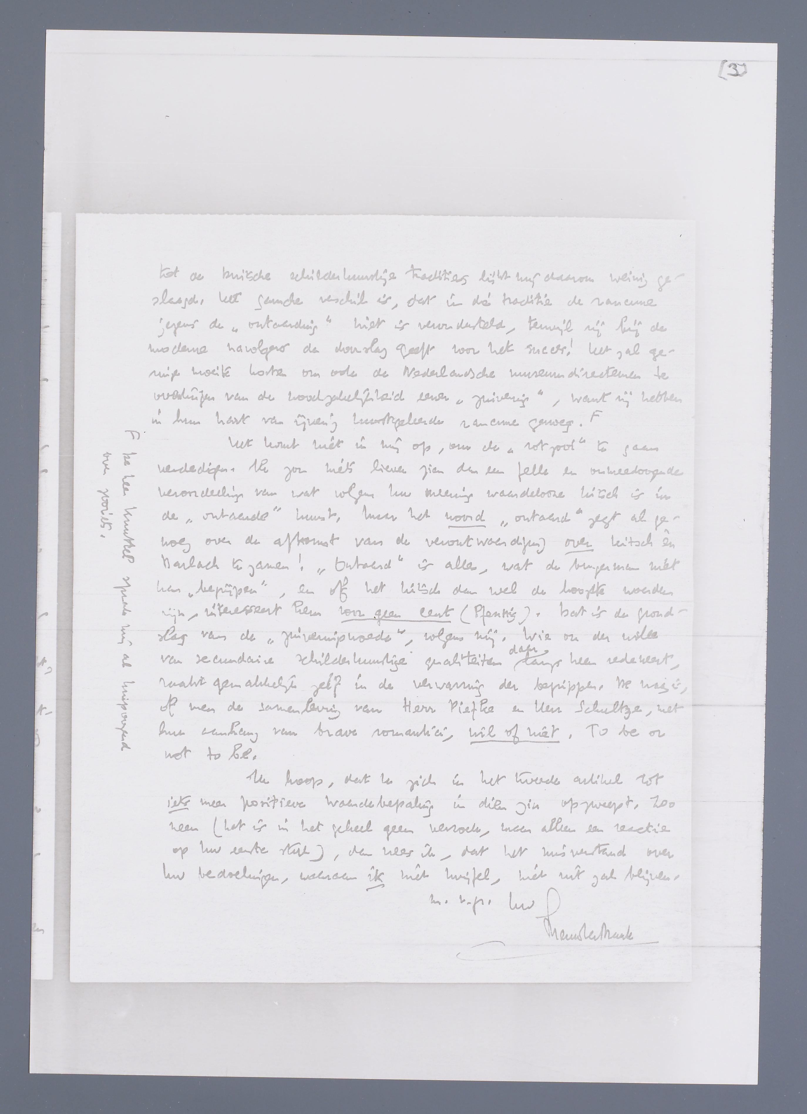 Het komt niet in mij op, om de ‘rotzooi’ te gaan verdedigen. Ik zou niets liever zien dan een felle en onmeedoogende veroordeeling van wat volgens Uw meening waardelooze kitsch is in de ‘ontaarde’ kunst, maar het woord ‘ontaard’ zegt al genoeg over de afkomst van de verontwaardiging over kitsch èn Barlach te zamen! ‘Ontaard’ is alles, wat de burgerman niet kan ‘begrijpen’, en of het kitsch dan wel de hoogste waarden zijn, interesseert hem voor geen cent (Pfennig). Dat is de grondslag van de ‘zuiveringswoede’, volgens mij. Wie om der wille van secundaire schilderkunstige qualiteiten daar langs heen redeneert, raakt gemakkelijk zelf in de verwarring der begrippen. De vraag is, of men de samenleving van Herr Piefke en Herr Schultze, met hun aanhang van brave romantici, wil of niet. To be or not to be.