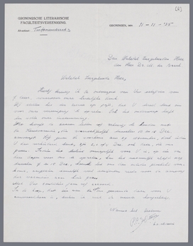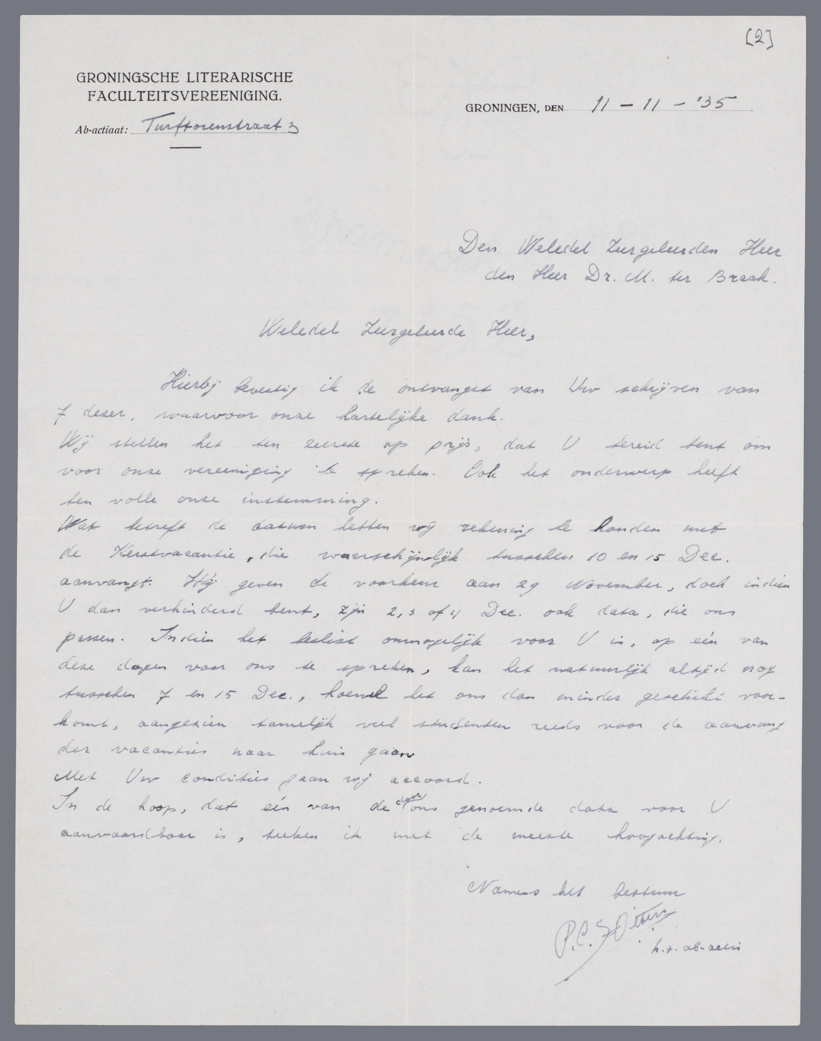 Wat betreft de datum hebben wij rekening te houden met de Kerstvacantie, die waarschijnlijk tusschen 10 en 15 Dec. aanvangt. Wij geven de voorkeur aan 29 November, doch indien U dan verhinderd bent, zijn 2, 3 of 4 Dec. ook data, die ons passen. Indien het beslist onmogelijk voor U is, op eén van deze dagen voor ons te spreken, kan het natuurlijk altijd nog tusschen 7 en 15 Dec., hoewel het ons dan minder geschikt voorkomt, aangezien tamelijk veel studenten reeds voor de aanvang der vacanties naar huis gaan.