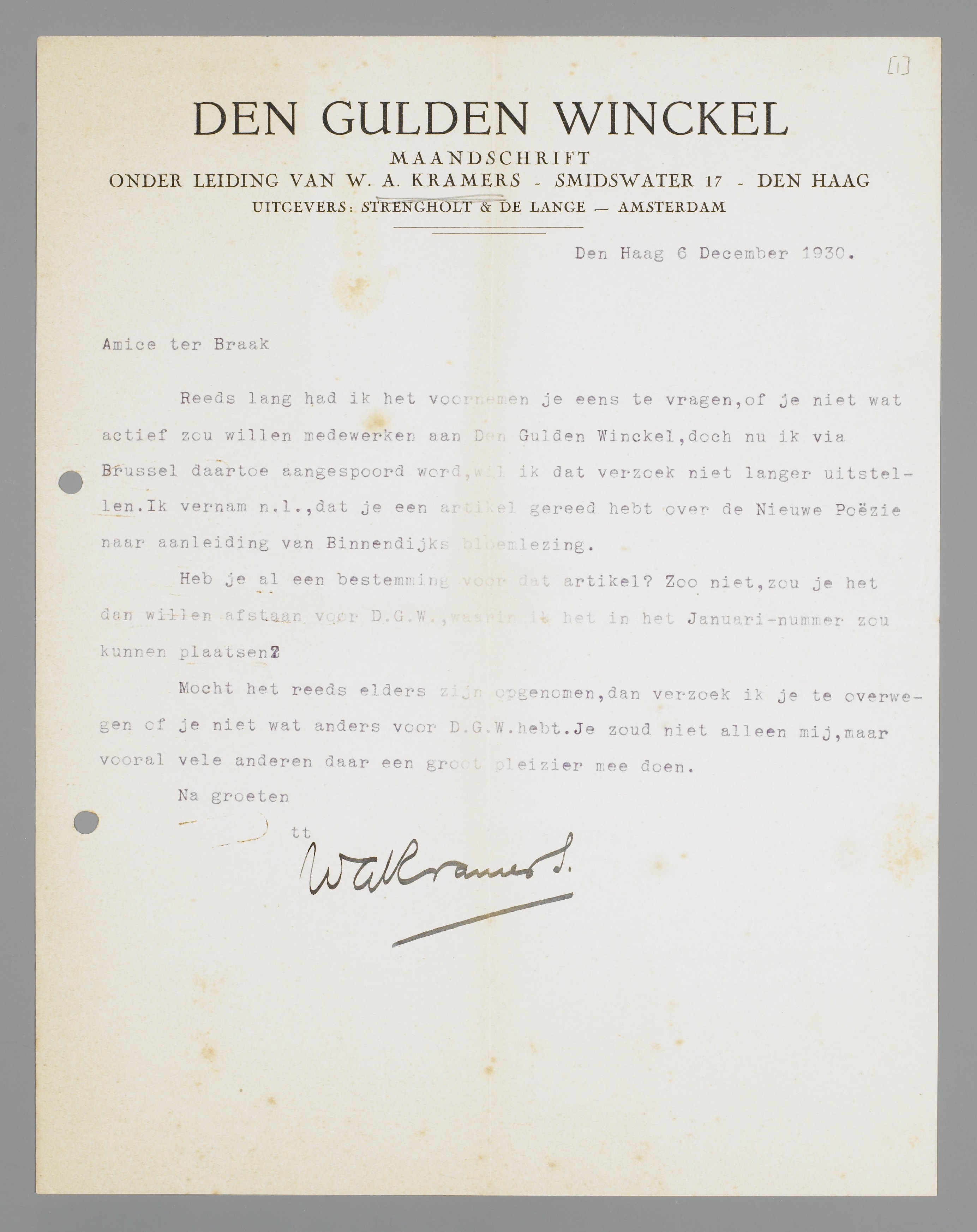 Reeds lang had ik het voornemen je eens te vragen, of je niet wat actief zou willen medewerken aan Den Gulden Winckel, doch nu ik via Brussel daartoe aangespoord word, wil ik dat verzoek niet langer uitstellen. Ik vernam n.l., dat je een artikel gereed hebt over de Nieuwe Poëzie naar aanleiding van Binnendijks bloemlezing.