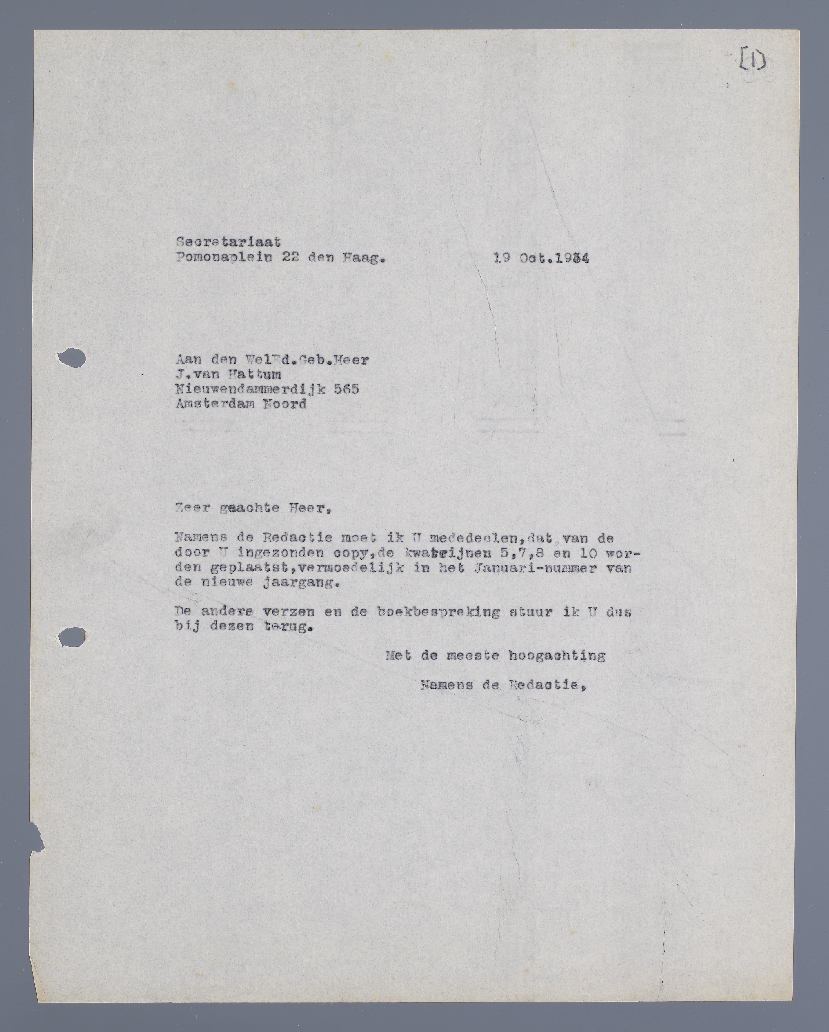 Namens de redactie moet ik U mededeelen, dat van de door U ingezonden copy, de kwatrijnen 5,7,8 en 10 worden geplaatst, vermoedelijk in het Januari-nummer van de nieuwe jaargang.