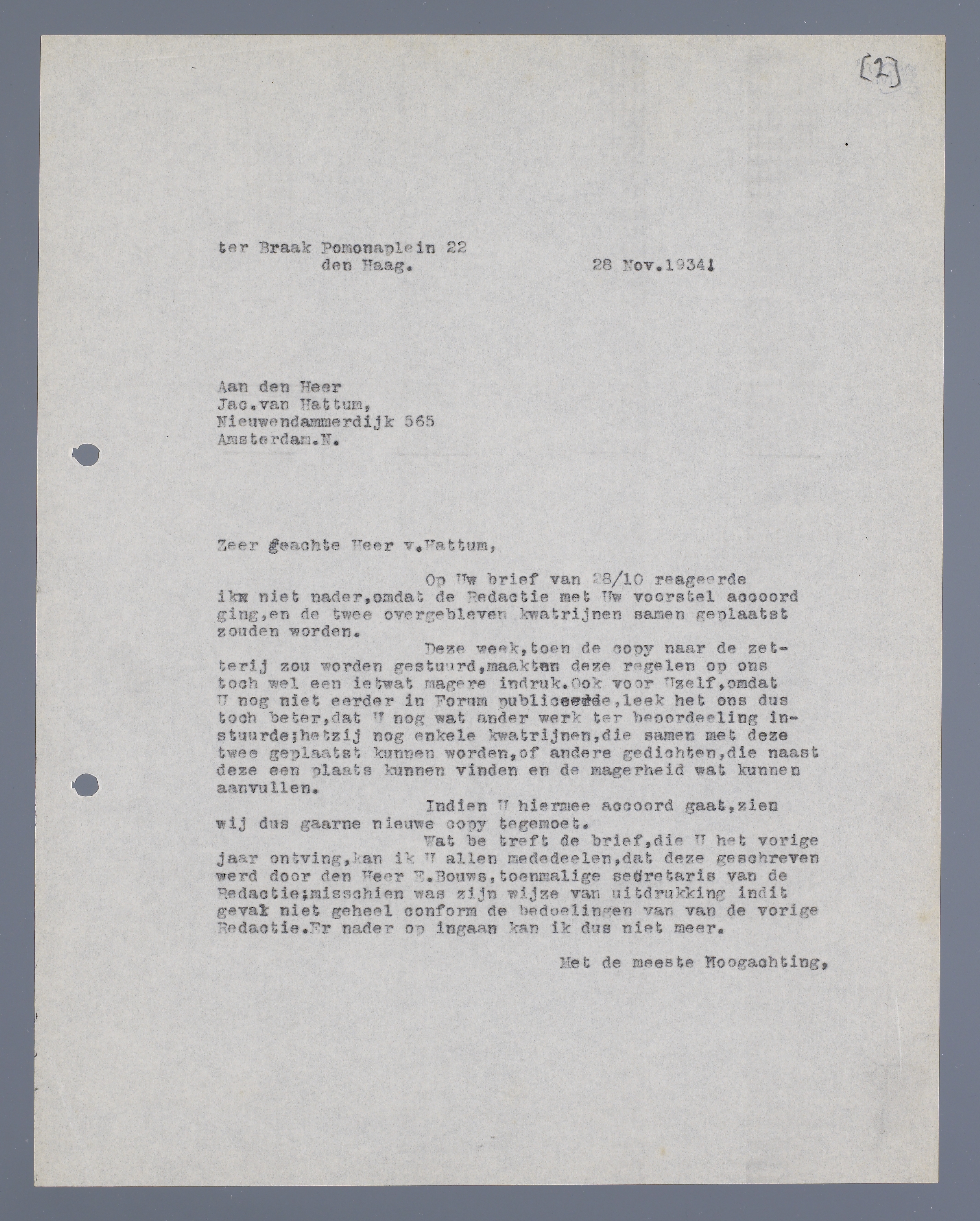 Deze week, toen de copij naar de zetterij zou worden gestuurd, maakten deze regelen op ons toch wel een ietwat magere indruk. Ook voor Uzelf, omdat U nog niet eerder in Forum publiceerde, leek het ons dus toch beter, dat U nog wat ander werk ter beoordeeling instuurde; hetzij nog enkele kwatrijnen, die samen met deze twee geplaatst kunnen worden, of andere gedichten, die naast deze een plaats kunnen vinden en de magerheid wat kunnen aanvullen.