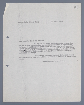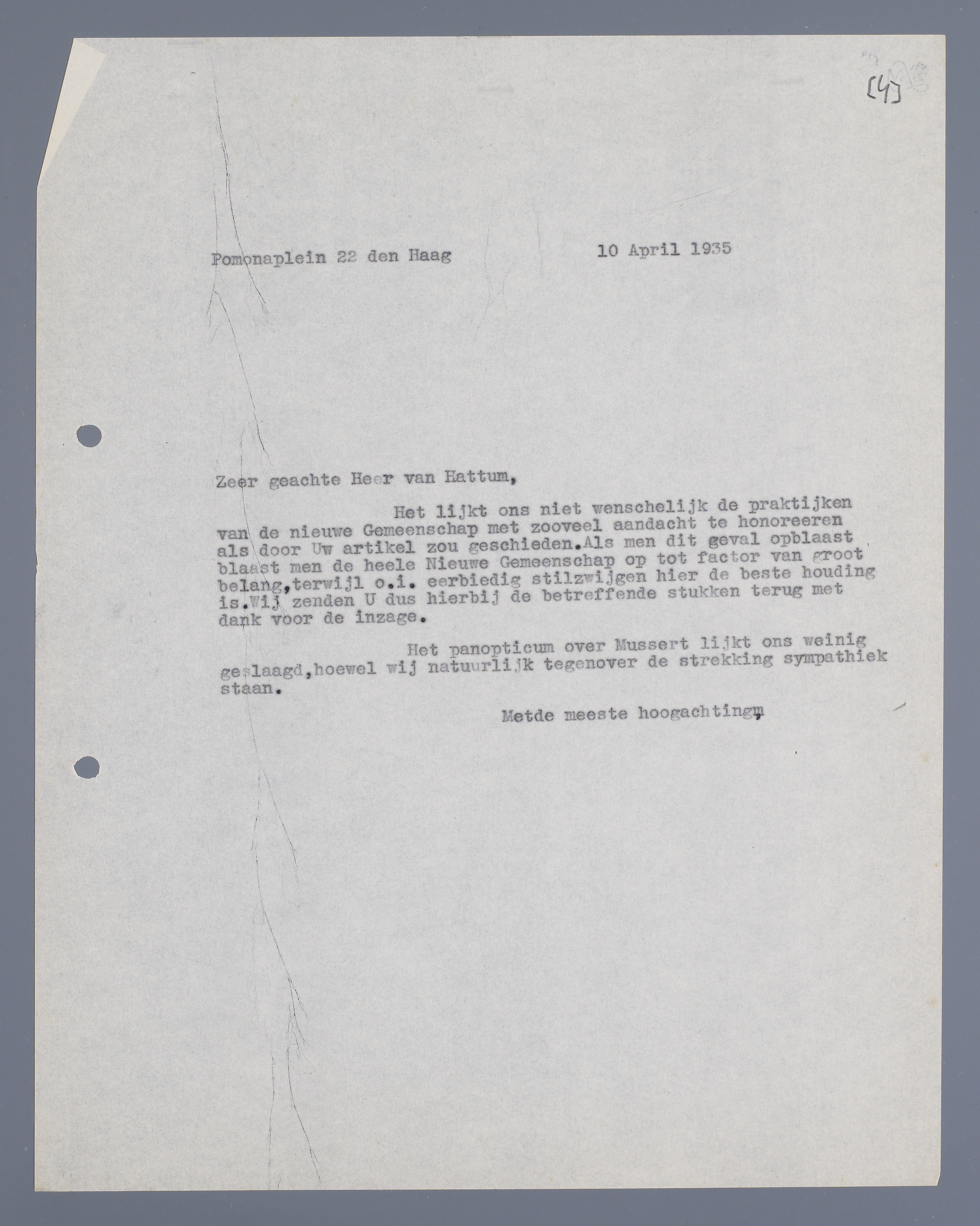 Het lijkt ons niet wenschelijk de praktijken van de nieuwe Gemeenschap met zooveel aandacht te honoreeren als door Uw artikel zou geschieden. Als men dit geval opblaast blaast men de heele Nieuwe Gemeenschap op tot factor van groot belang, terwijl o.i. eerbiedig stilzwijgen hier de beste houding is. Wij zenden U dus hierbij de betreffende stukken terug met dank voor de inzage.
