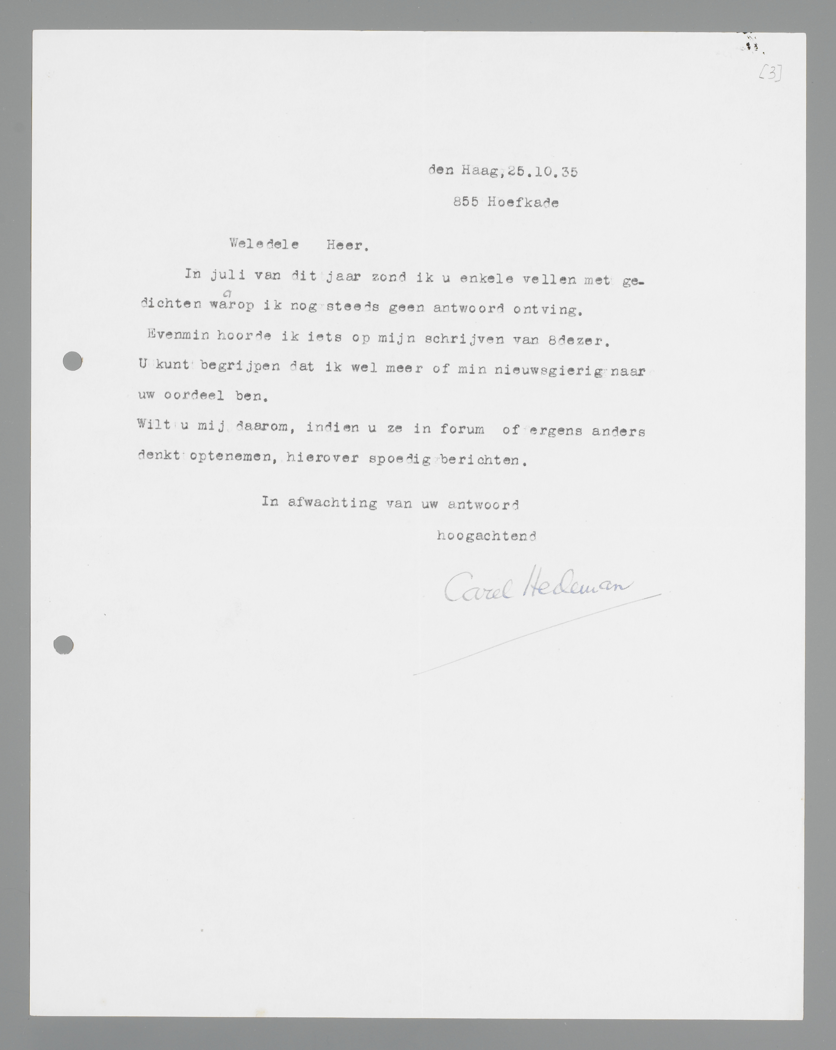 In juli van dit jaar zond ik u enkele vellen met gedichten waarop ik nog steeds geen antwoord ontving.