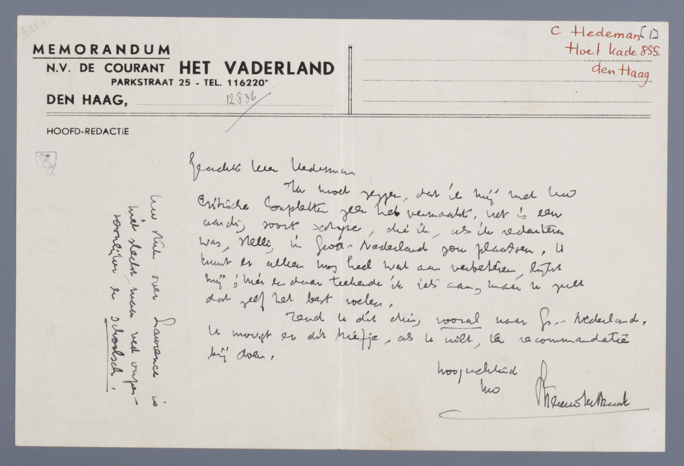 Zend U dit door, vooral naar Gr. Nederland, U moogt er dit briefje, als U wilt, ter recommandatie bij doen.