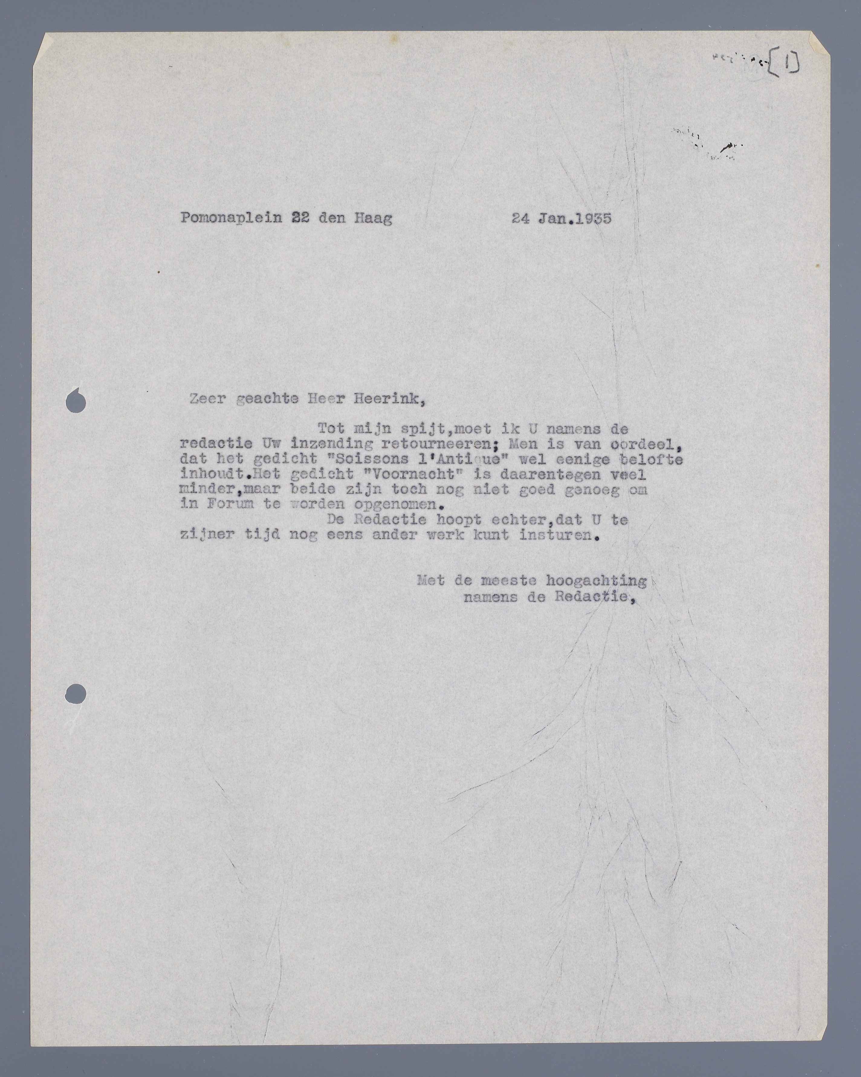 Tot mijn spijt, moet ik U namens de redactie uw inzending retourneeren; men is van oordeel, dat het gedicht ‘Soissons l'Antique’ wel eenige belofte inhoudt. Het gedicht ‘Voornacht’ is daarentegen veel minder, maar beide zijn toch nog niet goed genoeg om in Forum te worden opgenomen.