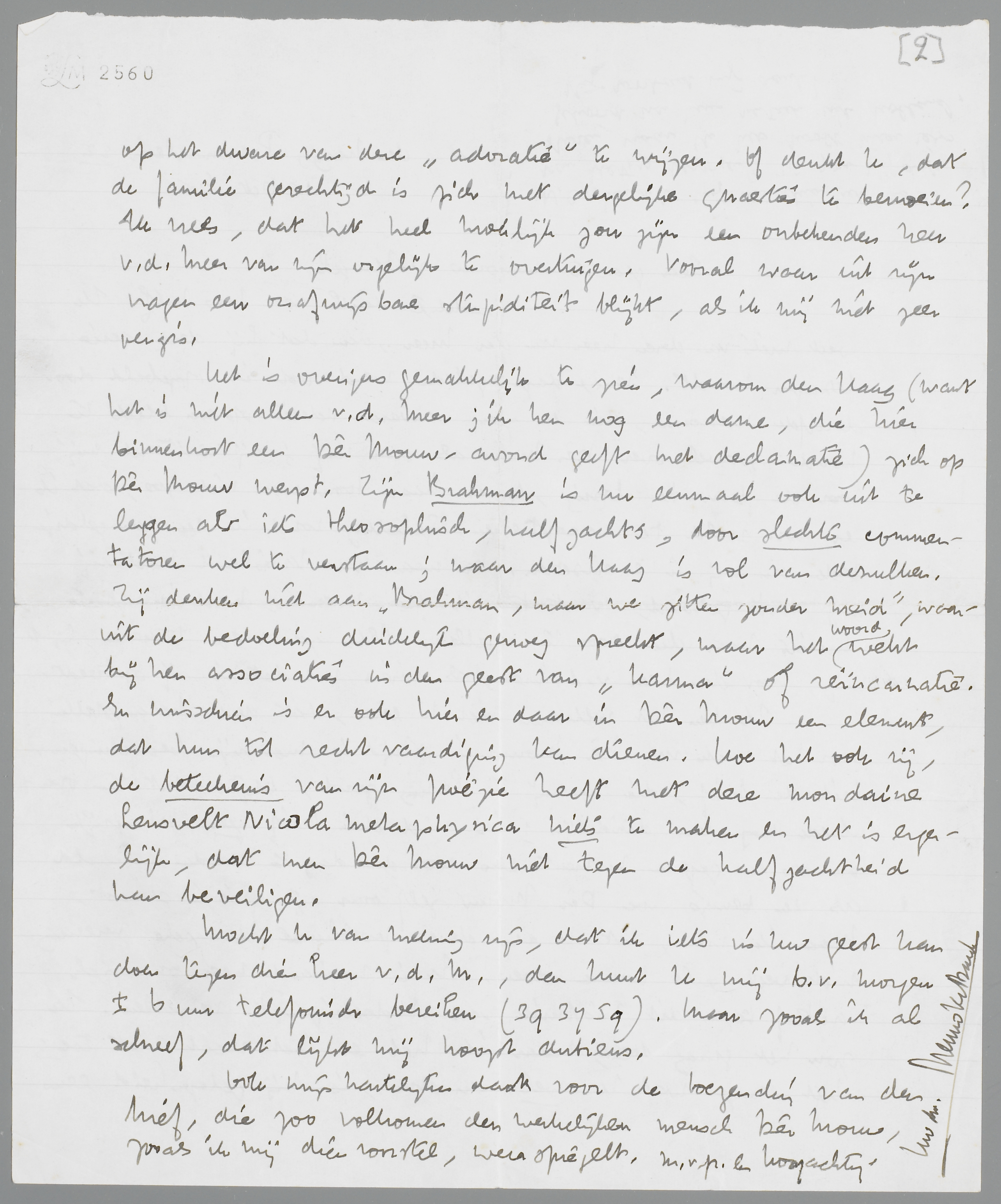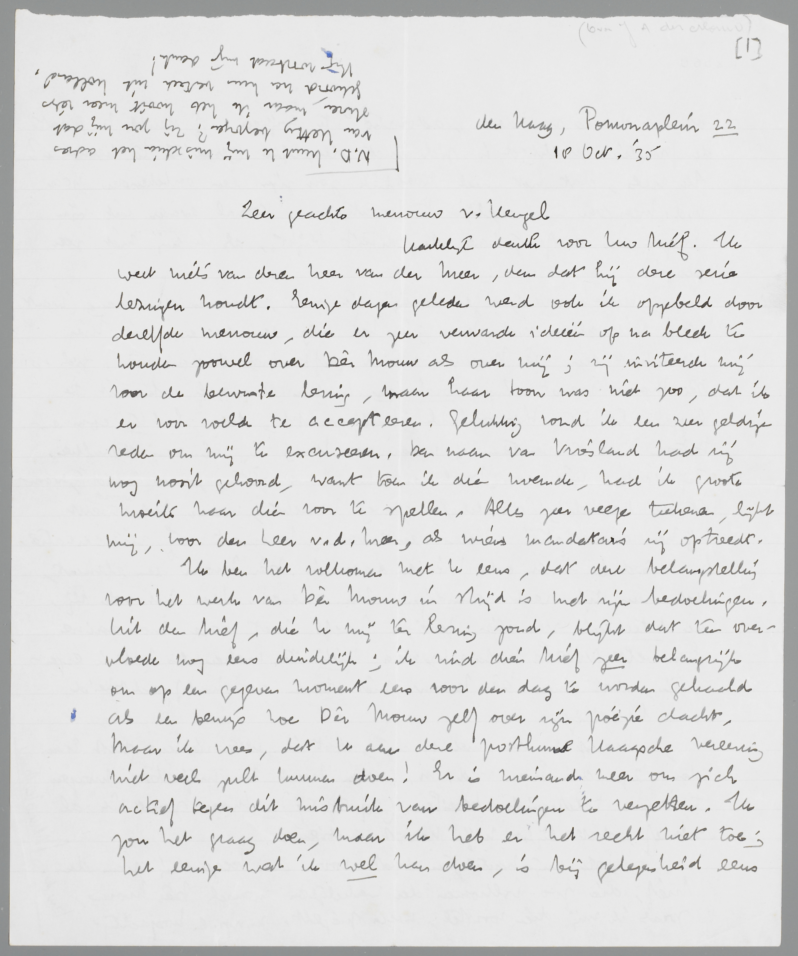 Ik ben het volkomen met U eens, dat deze belangstelling voor het werk van Dèr Mouw in strijd is met zijn bedoelingen. Uit den brief, die U mij ter lezing zond, blijkt dat ten overvloede nog eens duidelijk; ik vind dien brief zeer belangrijk om op een gegeven moment eens voor den dag te worden gehaald als een bewijs hoe Dèr Mouw zelf over zijn poëzie dacht, maar ik vrees, dat U aan deze posthume Haagsche vereering niet veel zult kunnen doen! Er is niemand meer om zich actief tegen dit misbruik van bedoelingen te verzetten. Ik zou het graag doen, maar ik heb er het recht niet toe; het eenige wat ik wel kan doen, is bij gelegenheid eens op het dwaze van deze ‘adoratie’ te wijzen. Of denkt U, dat de familie gerechtigd is zich met dergelijke quaesties te bemoeien? Ik vrees, dat het heel moeilijk zou zijn een onbekenden heer v.d. Meer van zijn ongelijk te overtuigen. Vooral waar uit zijn vragen een onafwijsbare stupiditeit blijkt, als ik mij niet zeer vergis.
