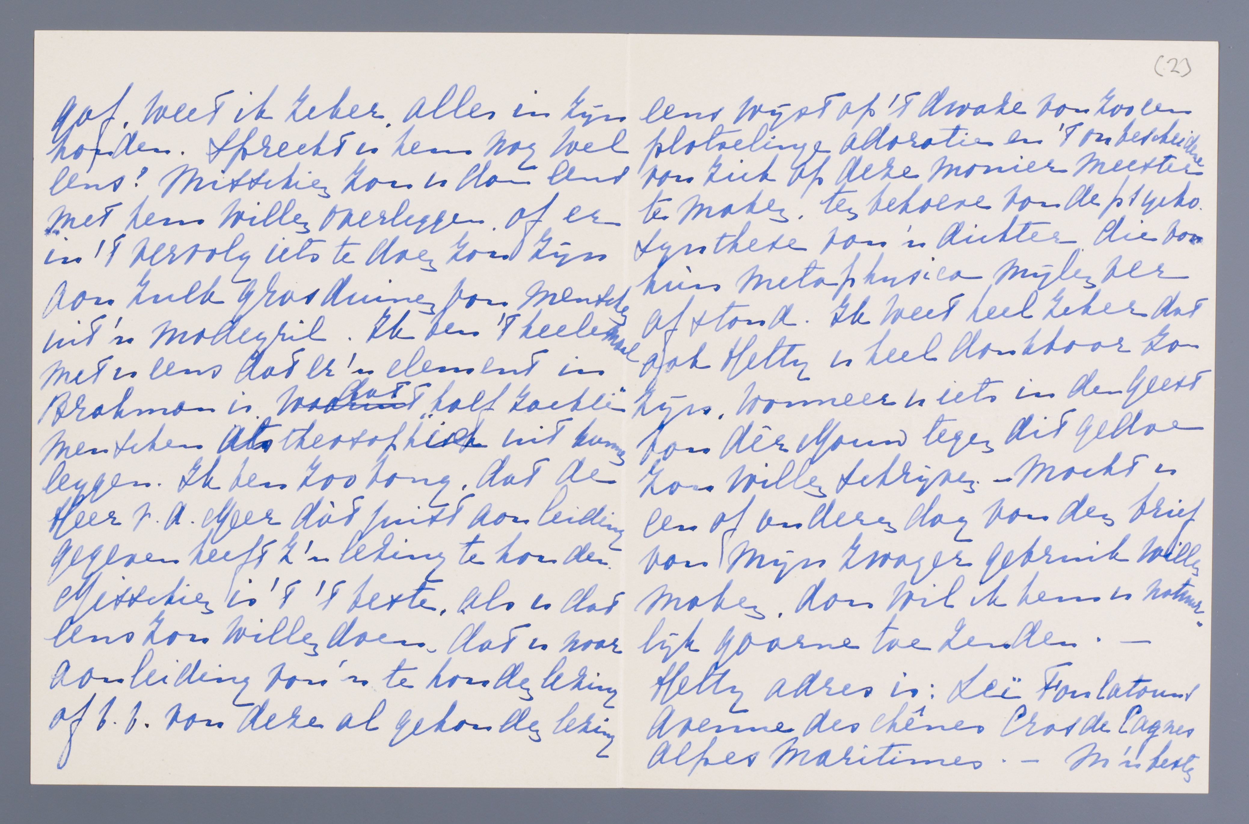 Misschien is 't 't beste, als u dat eens zou willen doen, dat u naar aanleiding van 'n te houden lezing of b.v. van deze al gehouden lezing eens wijst op 't dwaze van zoo een plotselinge adoratie en 't onbescheidene van zich op deze manier meester te maken, ten behoeve van de psychosynthese van 'n dichter die van hùn metaphysica mijlenver afstond. Ik weet heel zeker dat ook Hetty u heel dankbaar zou zijn, wanneer u iets in den geest van dèr Mouw tegen dit gedoe zou willen schrijven. - Mocht u een of andere dag van den brief van mijn zwager gebruik willen maken, dan wil ik hem u natuurlijk gaarne toezenden.-