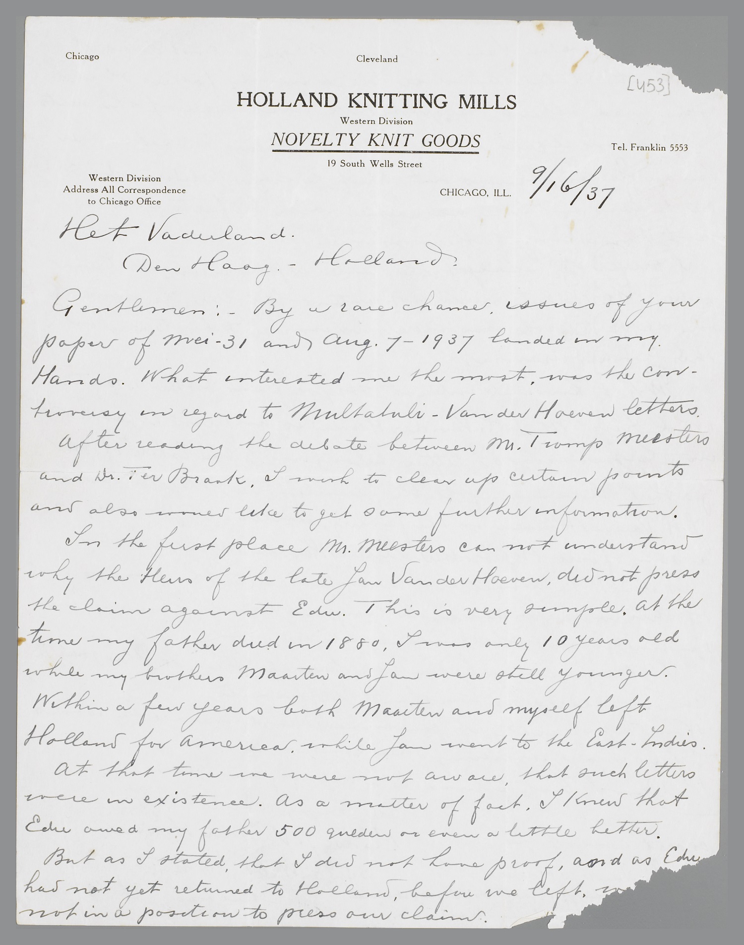 Gentlemen: - By a rare chance, issues of your papers of Mei-31 and Aug-1937 landed in my hands. What interested me the most, was the controversy in regard to Multatuli-Van der Hoeven letters.