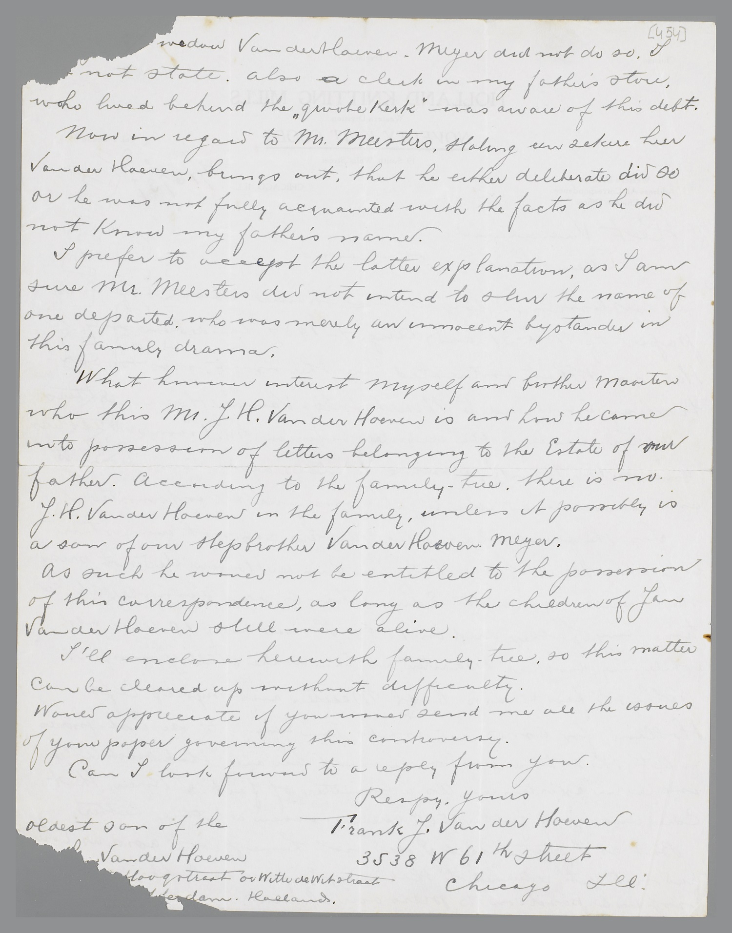 What however interets myself and brother Maarten who this Mr. J.H. Van der Hoeven is and how he came into possesion of letters belonging to the Estate of father. According to the family-tree, there is no J.H. Van der Hoeven in the family, unless it possibly is a son of our stepbrother van der Hoeven-Meyer.