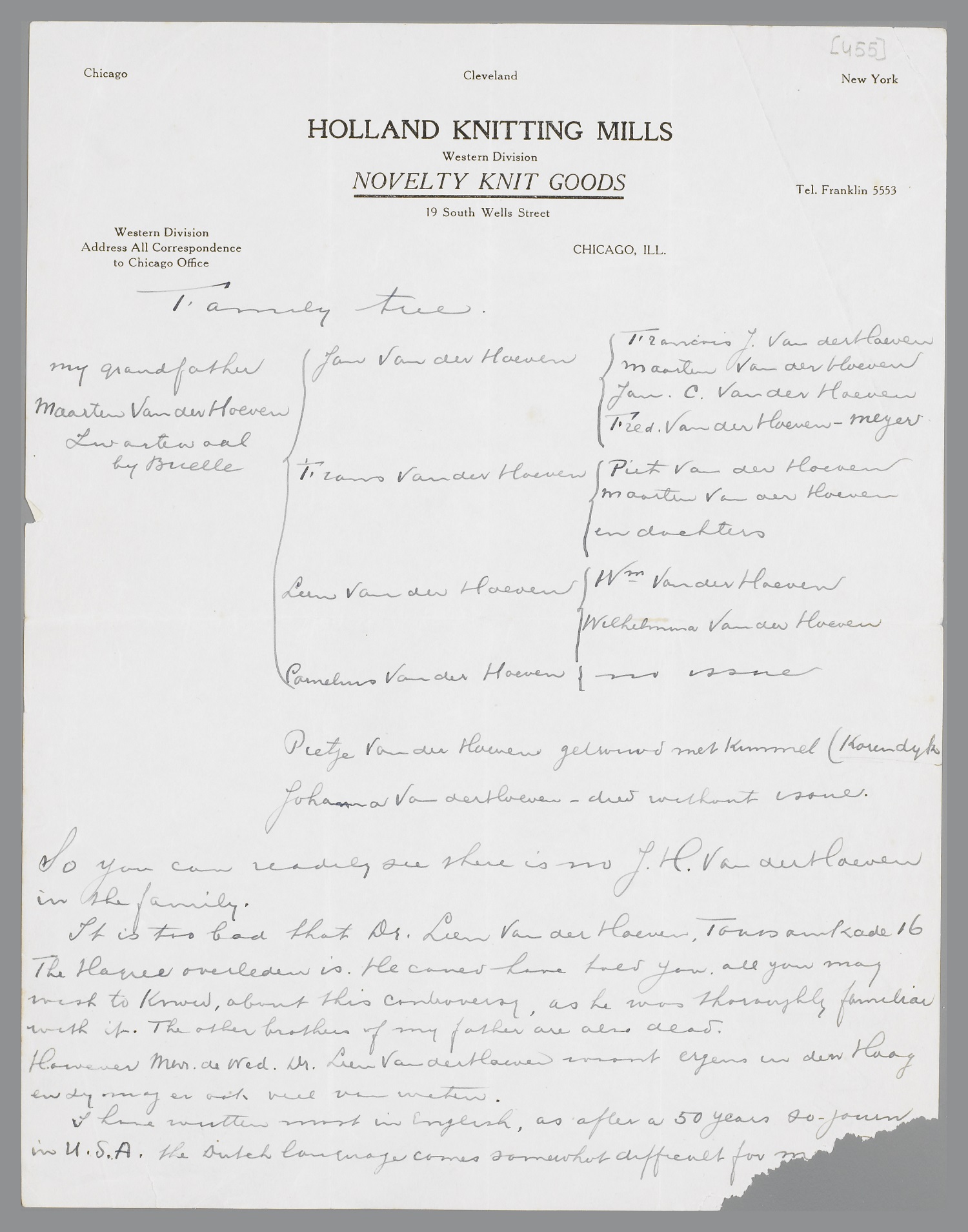 It is too bad that Dr. Leen van der Hoeven [kade?] 16 The Hague overleden is. He could have told you all you may wish to know, about this controversy, as he was thoroughly familiar with it. The other broters of my father are also dead. However Mevr. De Wed. Dr Leen van der Hoeven woont ergend in Den Haag en hij mag er ook veel van weten.