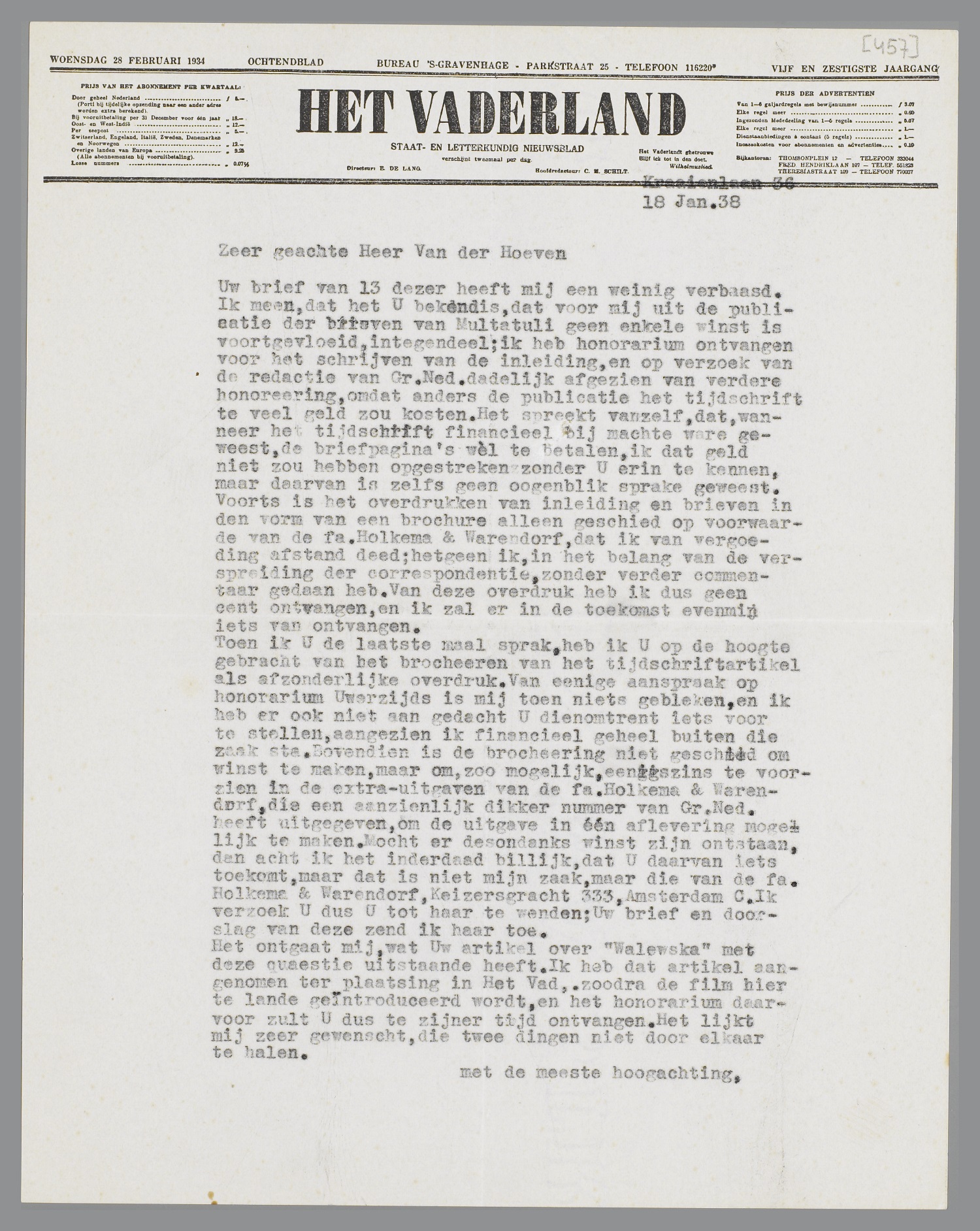 Uw brief van 13 dezer heeft mij een weinig verbaasd. Ik meen, dat het U bekend is, dat voor mij uit de publicatie der brieven van Multatuli geen enkele winst is voortgevloeid, integendeel; ik heb honorarium ontvangen voor het schrijven van de inleidingen, en op verzoek van de redactie van Gr. Ned. dadelijk afgezien van verdere honoreering, omdat anders de publicatie het tijdschrift te veel geld zou kosten. Het spreekt vanzelf, dat, wanner het tijdschrift financieel bij machte ware geweest, de briefpagina's wèl te betalen, ik dat geld niet zou hebben opgestreken zonder U erin te kennen, maar daarvan is zelfs geen oogenblik sprake geweest. Voorts is het overdrukken van inleiding en brieven in den vorm van een brochure alleen geschied op voorwaarde van de fa. Holkema & Warendorf, dat ik van de vergoeding afstand deed; hetgeen ik, in het belang van de verspreiding der correspondentie, zonder verder commentaar gedaan heb. Van deze overdruk heb ik dus geen cent ontvangen, en ik zal er in de toekomst evenmin iets van ontvangen.