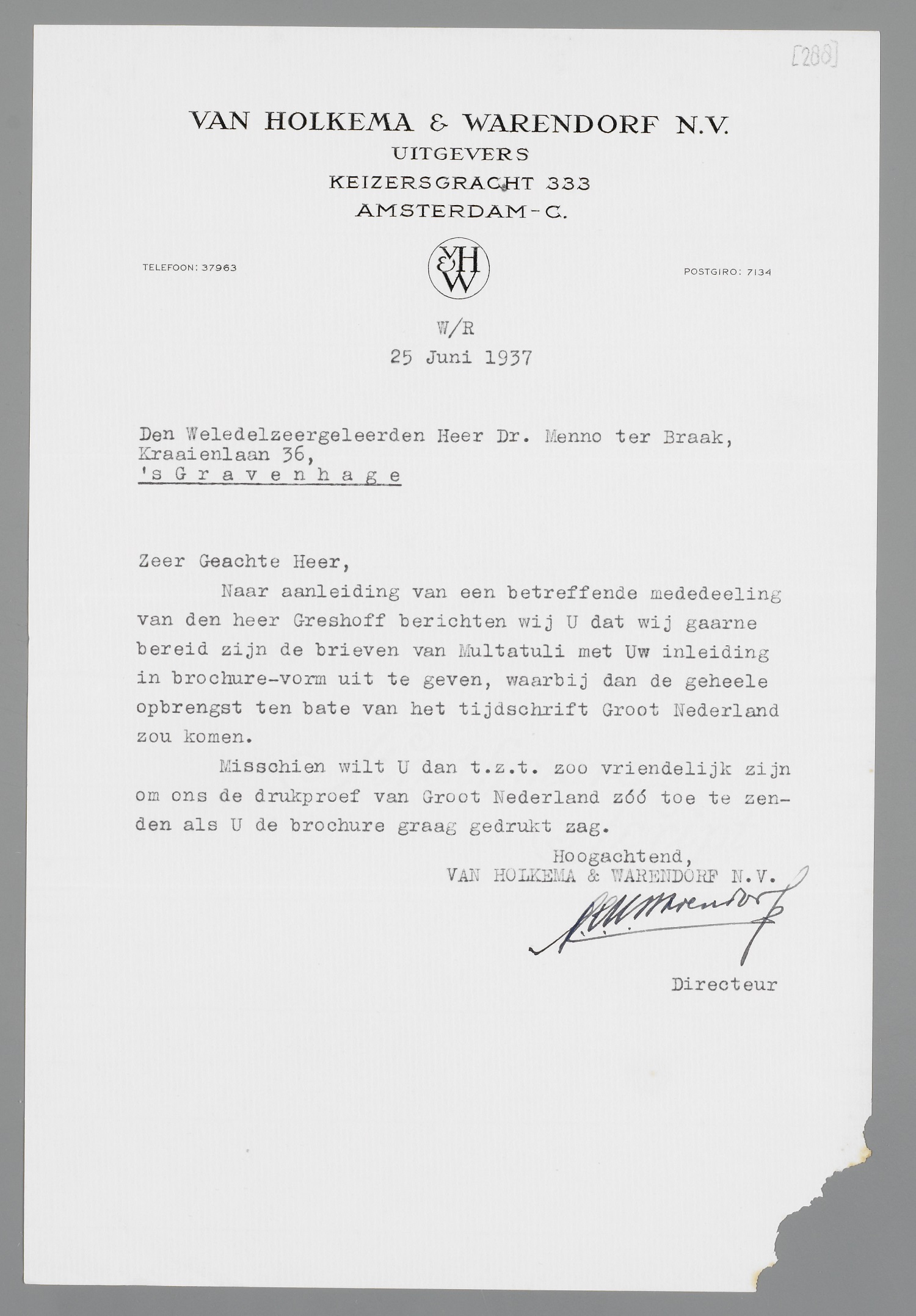 Naar aanleiding van een betreffende mededeeling van den heer Greshoff berichten wij U dat wij gaarne bereid zijn de brieven van Multatuli met Uw inleiding in brochure-vorm uit te geven, waarbij dan de geheele opbrengst ten bate van het tijdschrift Groot Nederland zou komen.