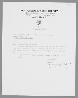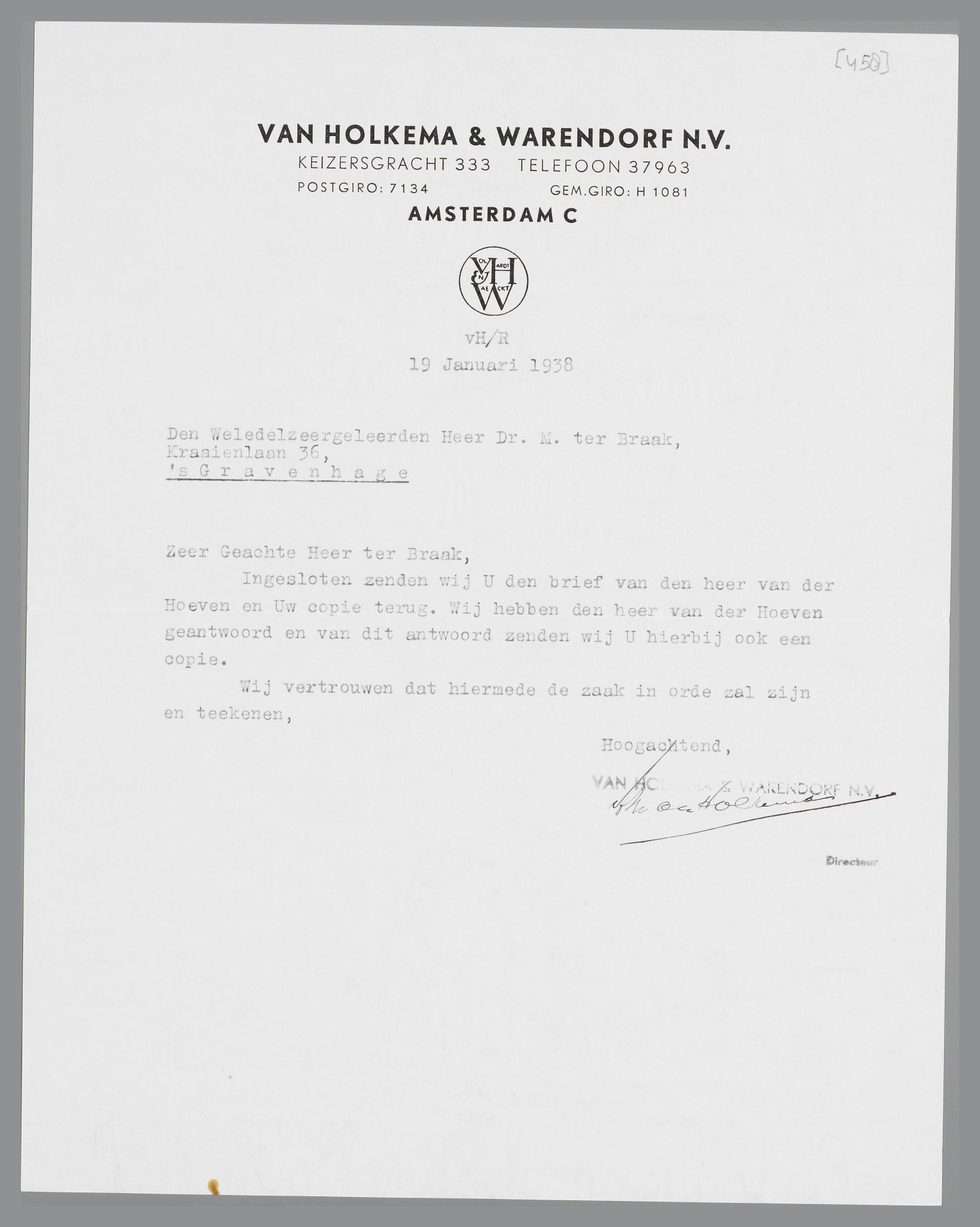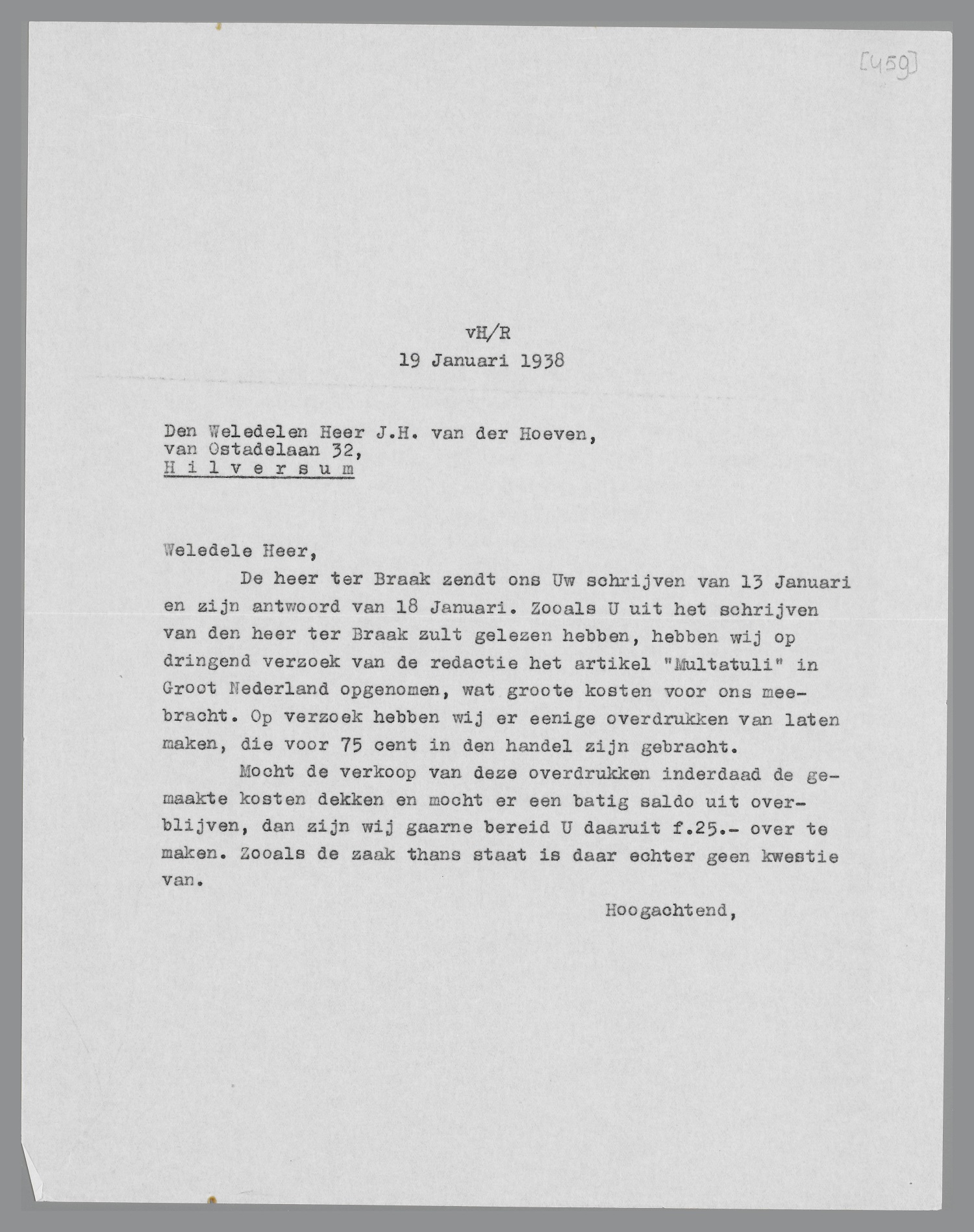 De heer ter Braak zendt ons Uw schrijven van 13 Januari en zijn antwoord van 18 Januari. Zooals U uit het schrijven van den heer ter Braak zult gelezen hebben, hebben wij op dringend verzoek van de redactie het artikel ‘Multatuli’ in Groot Nederland opgenomen, wat groote kosten voor ons meebracht. Op verzoek hebben wij er eenige overdrukken van laten maken, die voor 75 cent in den handel zijn gebracht.