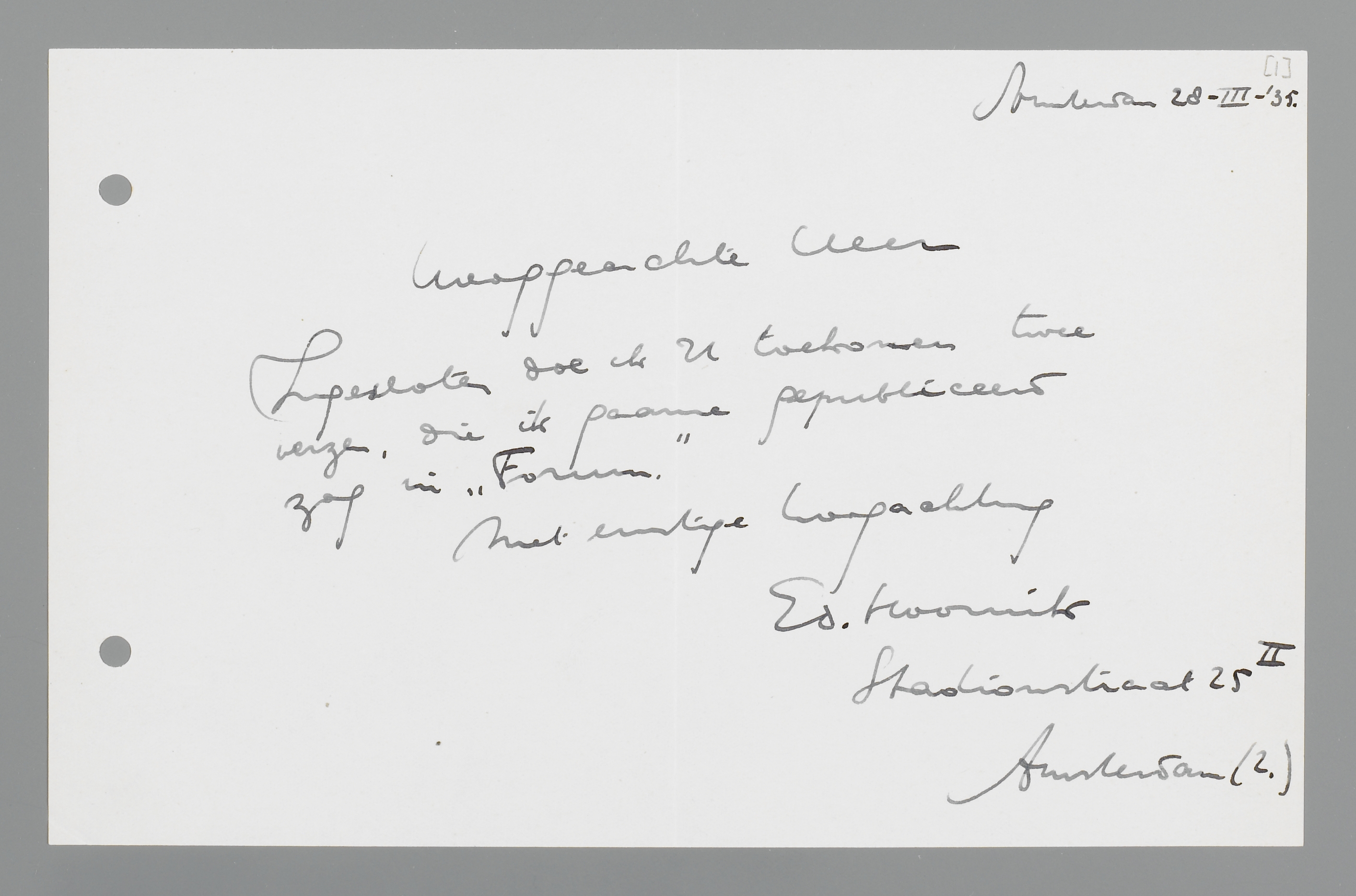 Ingesloten doe ik U toekomen twee verzen, die ik gaarne gepubliceerd zag in ‘Forum’.
