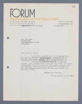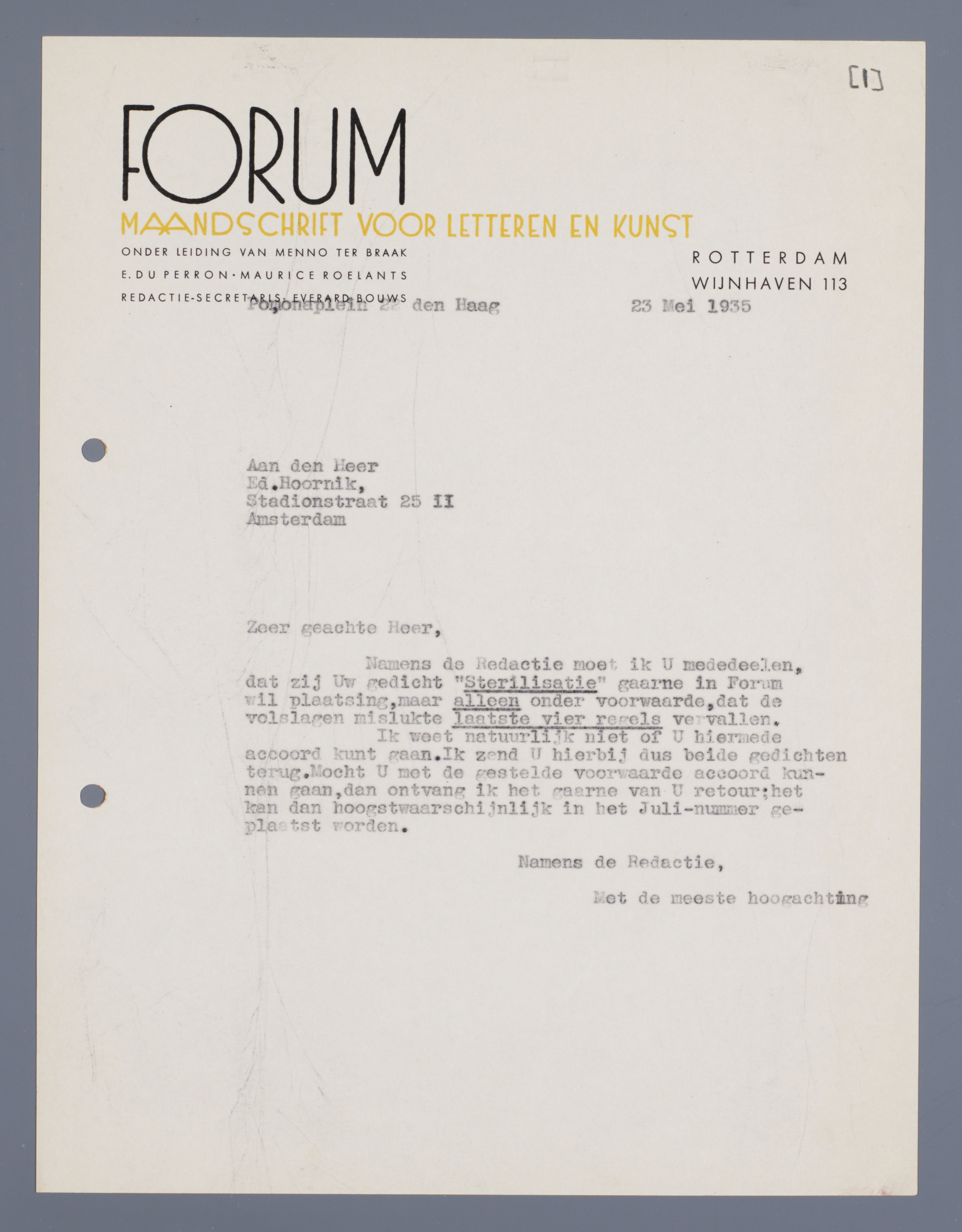 Namens de Redactie moet ik U mededeelen, dat zij Uw gedicht ‘Sterilisatie’ gaarne in Forum wil [plaatsen], maar alleen onder voorwaarde, dat de volslagen mislukte laatste vier regels vervallen.