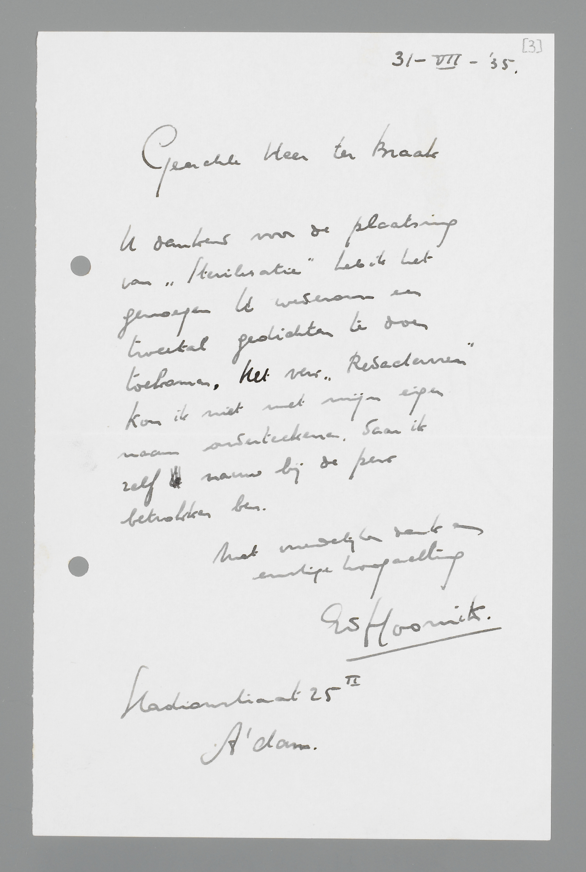 U dankend voor de plaatsing van ‘Sterilisatie’ heb ik het genoegen U wederom een tweetal gedichten te doen toekomen. Het vers ‘Redacteuren’ kon ik niet met mijn eigen naam onderteekenen, daar ik zelf nauw bij de pers betrokken ben.