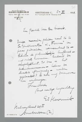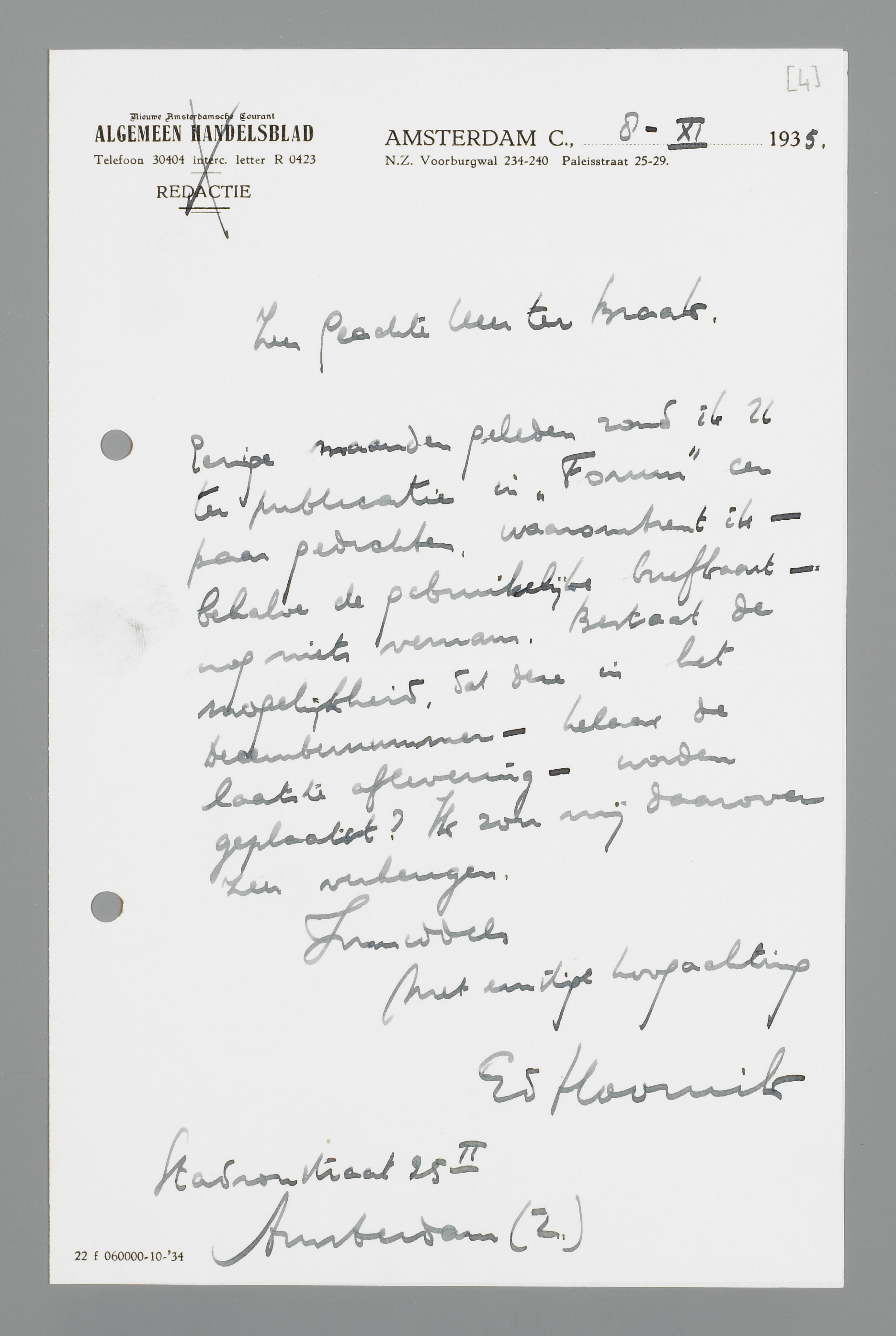 Eenige maanden geleden zond ik U ter publicatie in ‘Forum’ een paar gedichten, waaromtrent ik -behalve de gebruikelijke briefkaart- nog niets vernam. Bestaat de mogelijkheid, dat deze in het Decembernummer -helaas de laatste aflevering- worden geplaatst? Ik zou mij daarover zeer verheugen.