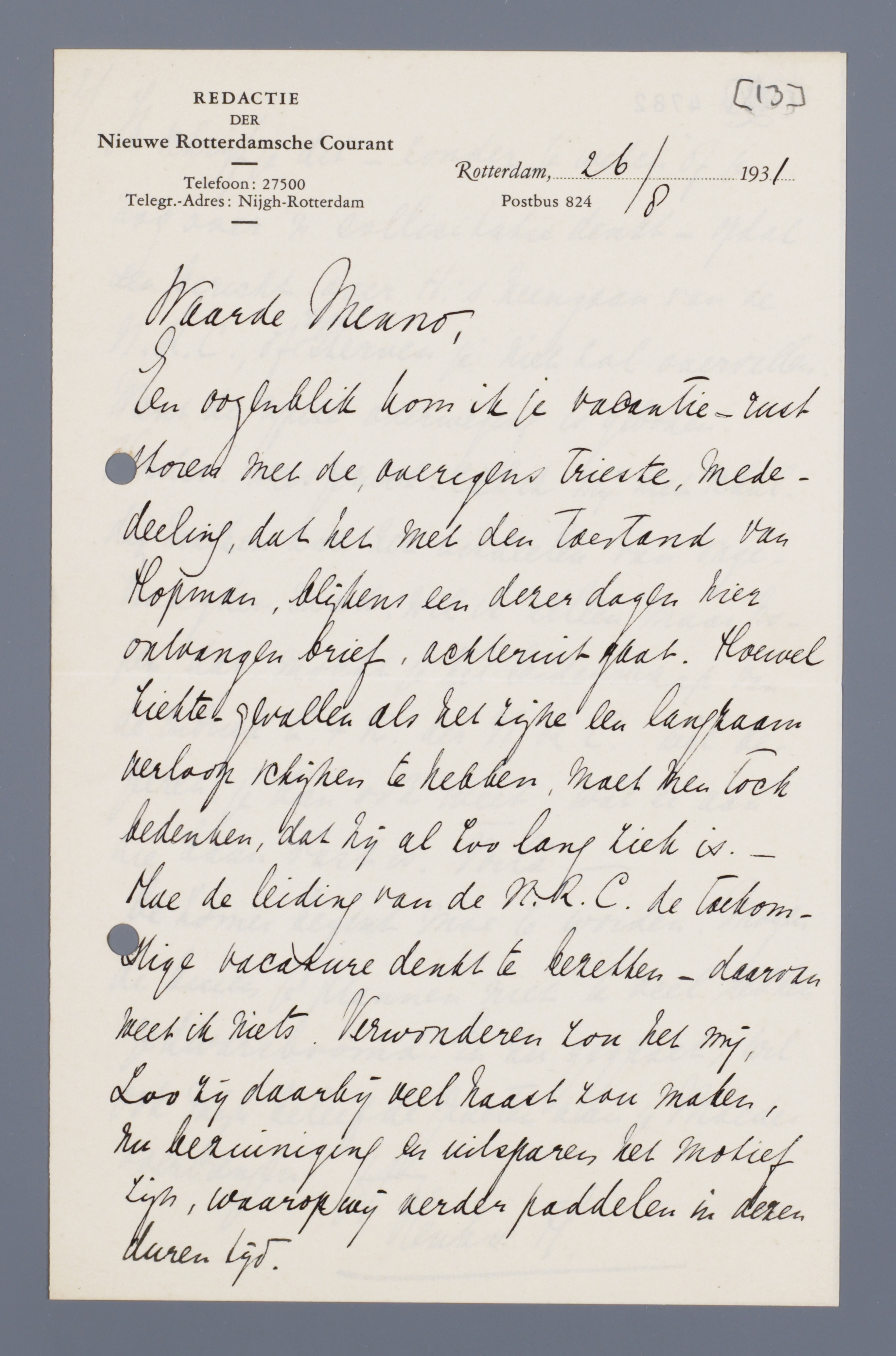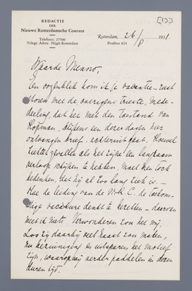 Origineel: Den Haag, Letterkundig Museum. Briefhoofd Redactie de Nieuwe Rotterdamsche Courant.