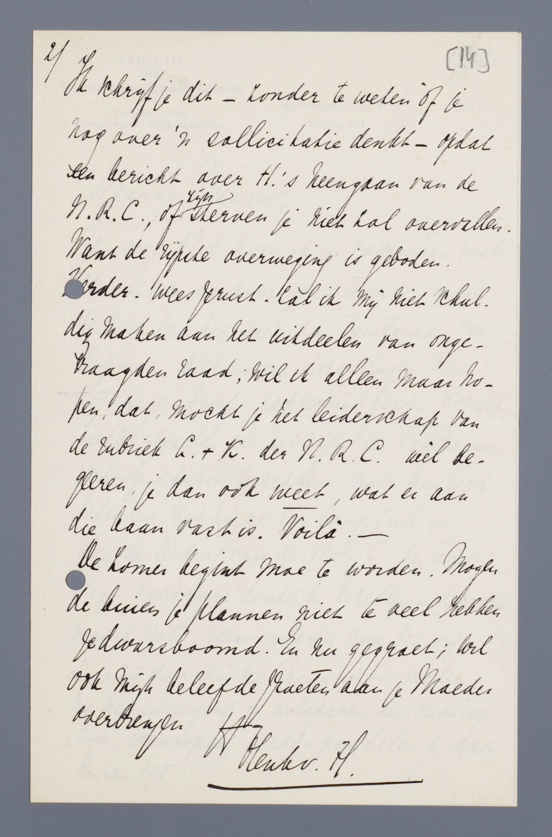 Ik schrijf je dit - zonder te weten of je nog over 'n sollicitatie denkt - opdat een bericht over H.'s heengaan van de N.R.C., of zijn sterven je niet zal overvallen. Want de rijpste overweging is geboden.