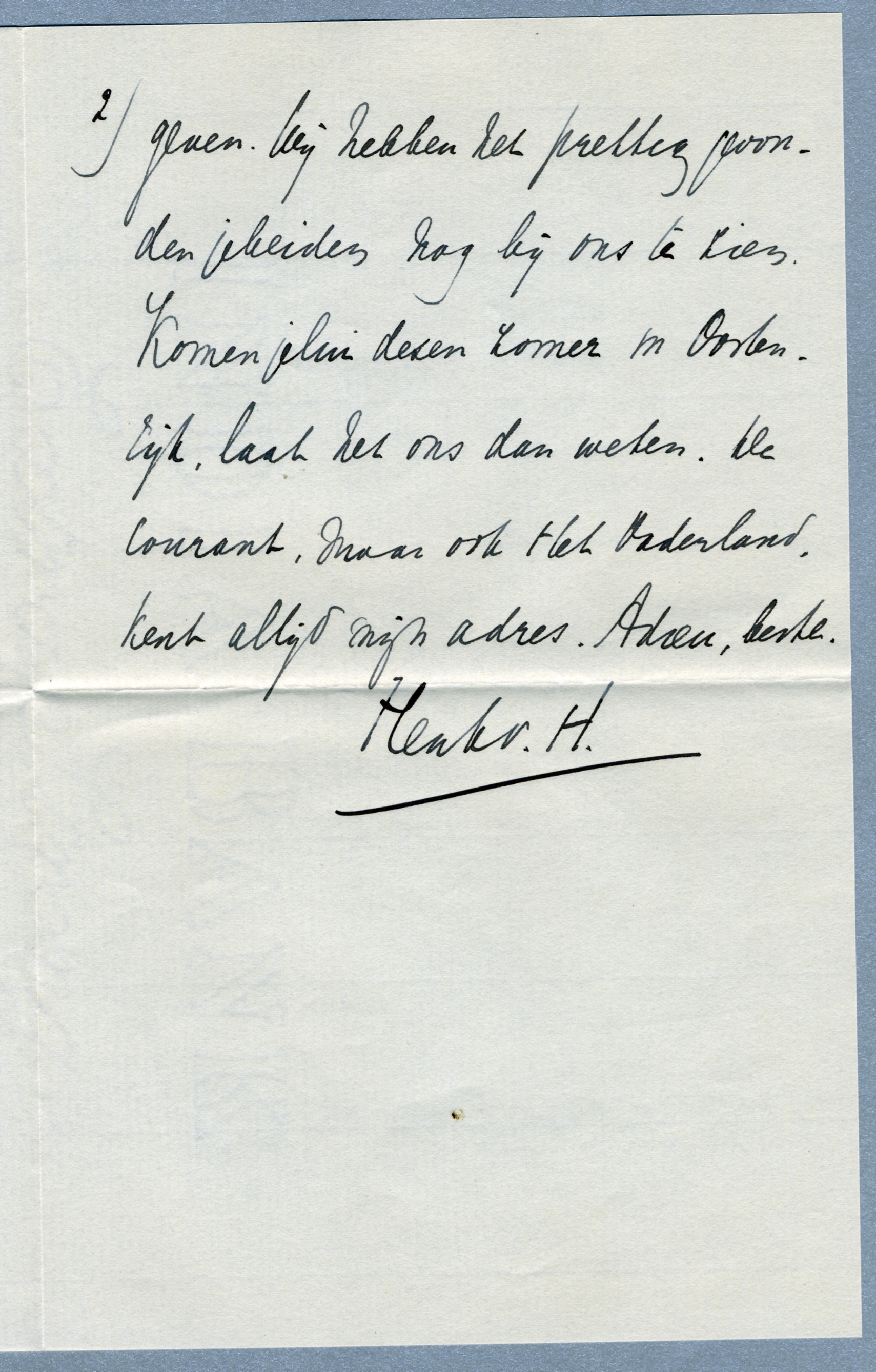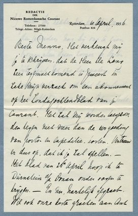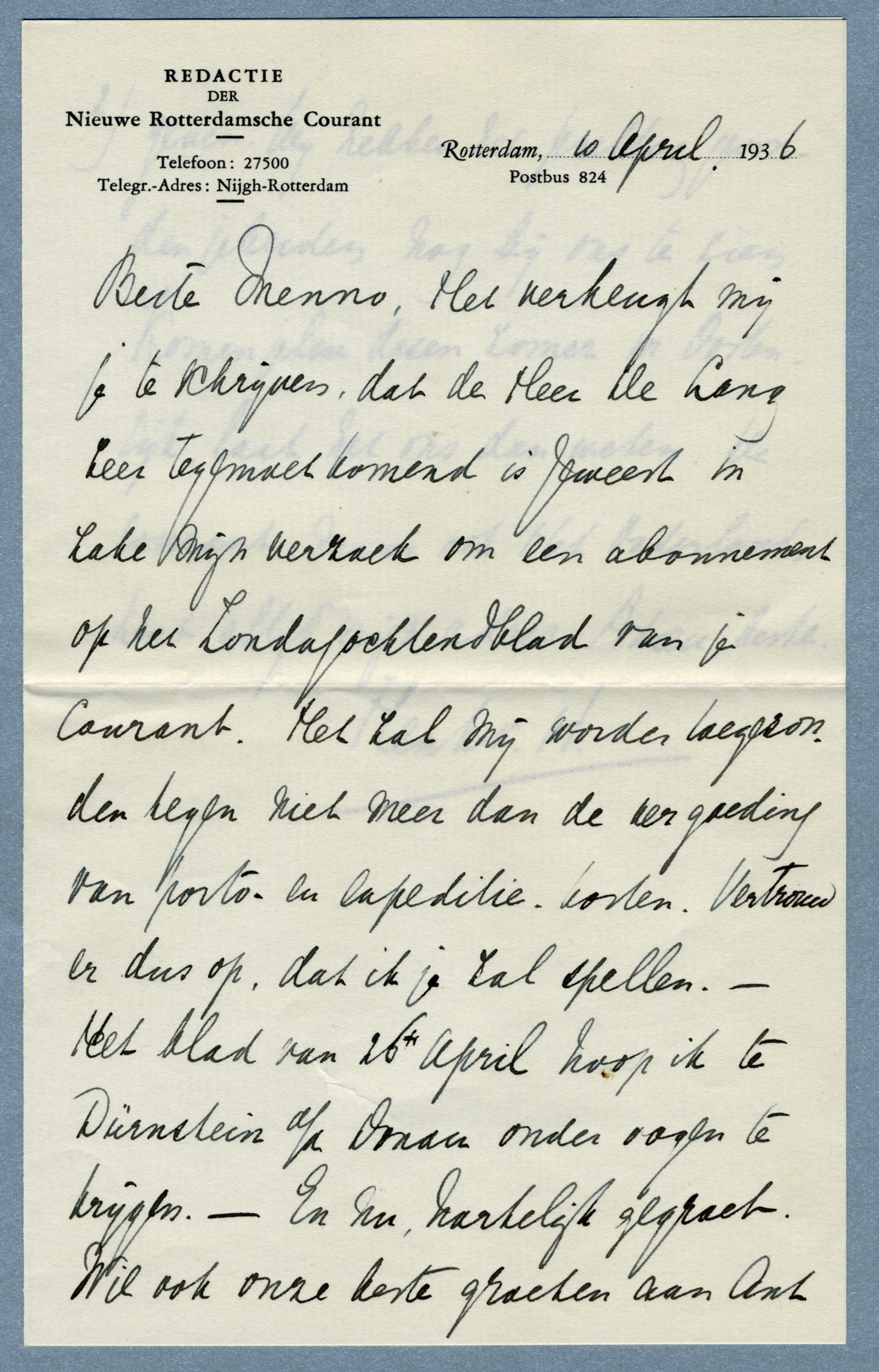 Het verheugt mij je te schrijven, dat de Heer de Lang zeer tegemoetkomend is geweest in zake mijn verzoek om een abonnement op het Zondagochtendblad van je Courant. Het zal mij worden toegezonden tegen niet meer dan de vergoeding van porto- en expeditie-kosten. Vertrouw er dus op, dat ik je zal spellen. -