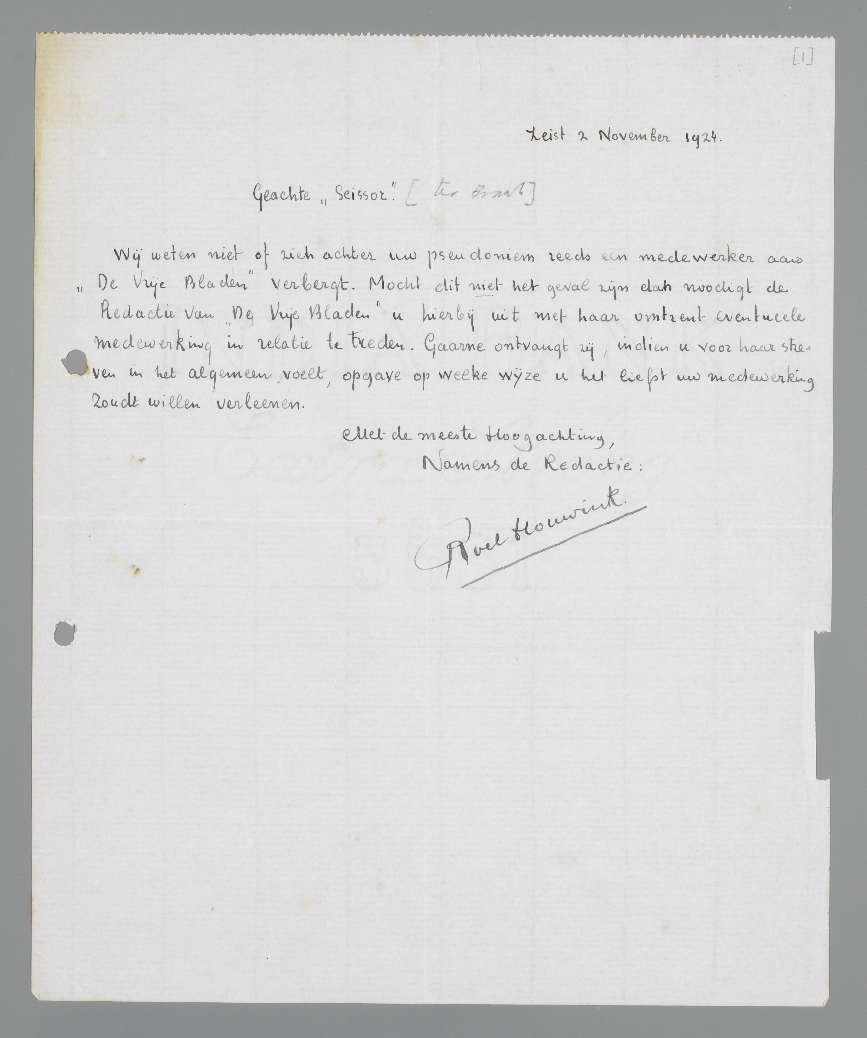Wij weten niet of zich achter uw pseudoniem reeds een medewerker aan ‘De Vrije Bladen’ verbergt. Mocht dit niet het geval zijn dan noodigt de Redactie van ‘De Vrije Bladen’ u hierbij uit met haar omtrent eventueele medewerking in relatie te treden. Gaarne ontvangt zij, indien u voor haar streven in het algemeen voelt, opgave op welke wijze u het liefst uw medewerking zoudt willen verleenen.