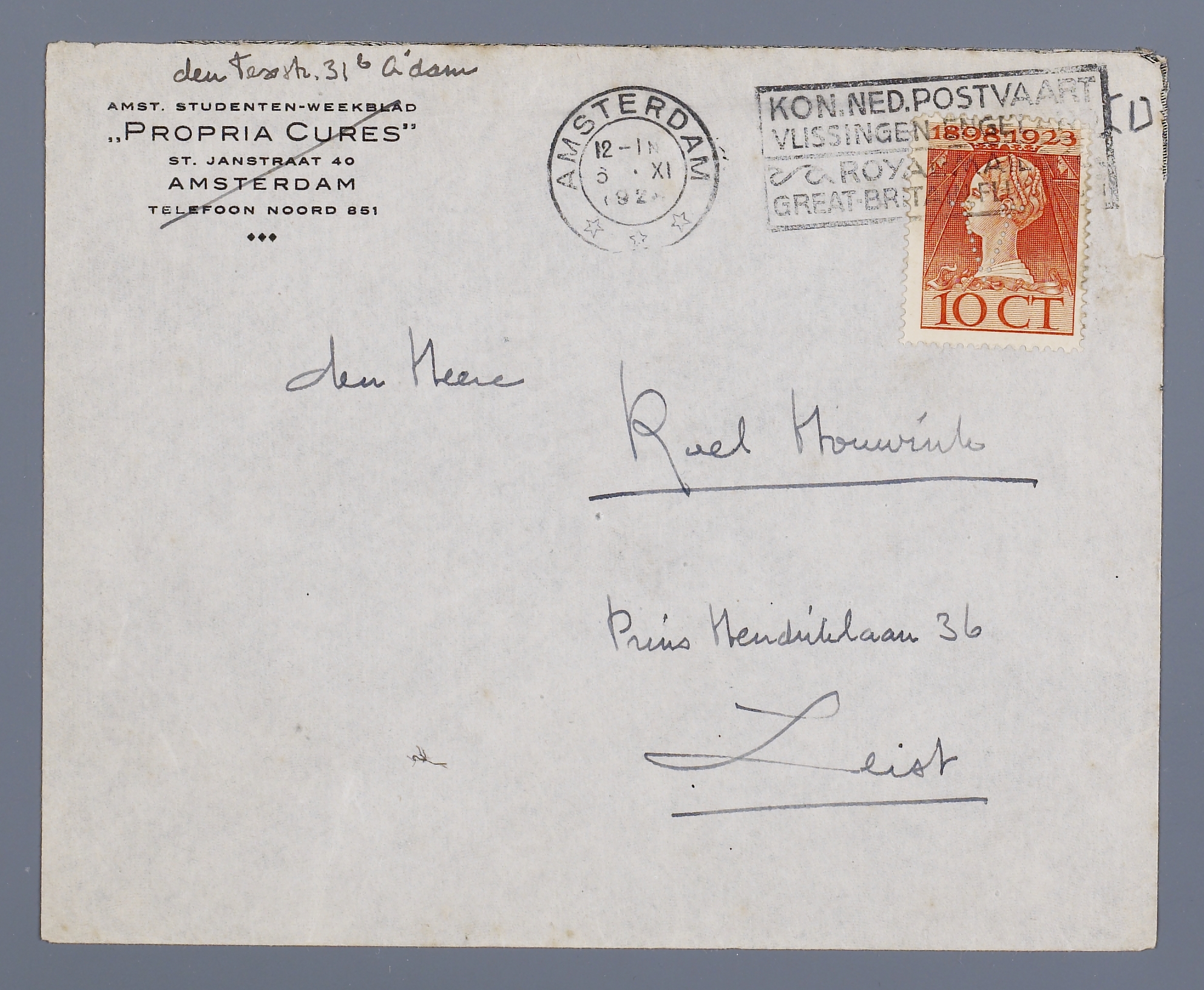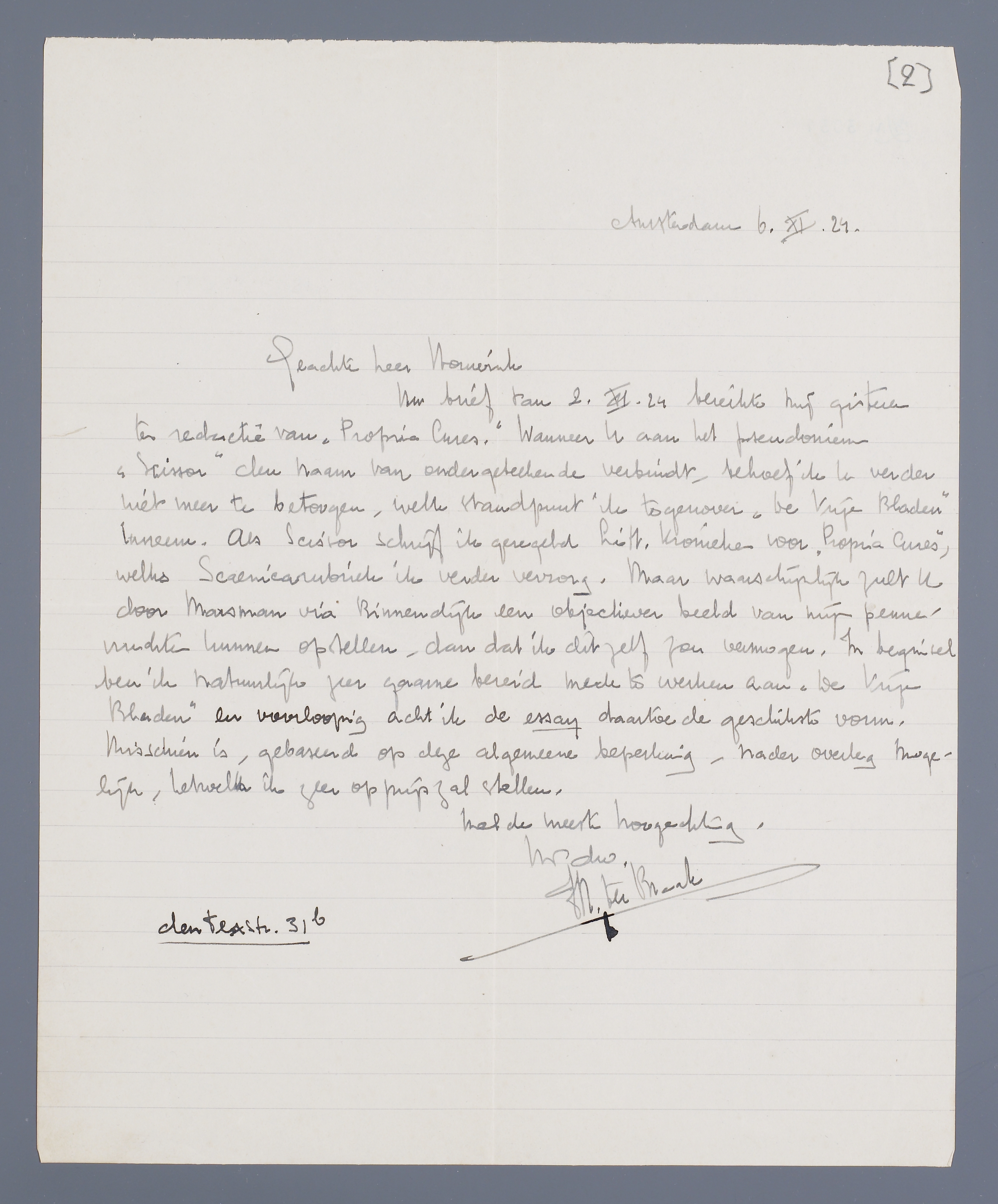 Uw brief van 2. XI. 24 bereikte mij gisteren ter redactie van ‘Propria Cures’. Wanneer U aan het pseudoniem ‘Scissor’ den naam van ondergetekende verbindt, behoef ik U verder niet meer te betoogen, welk standpunt ik tegenover ‘De Vrije Bladen’ inneem. Als Scissor schrijf ik geregeld Litt. Kronieken voor ‘Propria Cures’, welks Scaenicarubriek ik verder verzorg. Maar waarschijnlijk zult U door Marsman via Binnendijk een objectiever beeld van mijn pennevruchten kunnen opstellen, dan dat ik dit zelf zou vermogen. In beginsel ben ik natuurlijk zeer gaarne bereid mede te werken aan ‘De Vrije Bladen’ en voorloopig acht ik de essay daartoe de geschikste vorm. Misschien is, gebaseerd op deze algemeene beperking, nader overleg mogelijk, hetwelk ik zeer op prijs zal stellen.