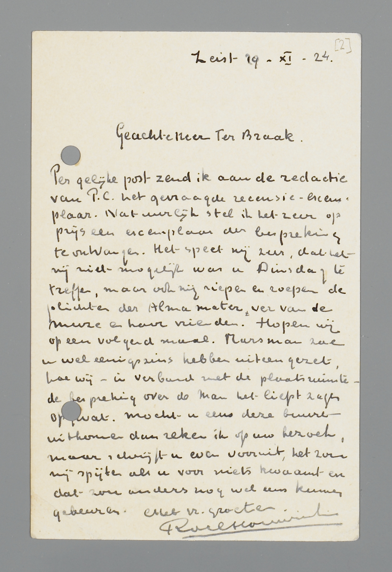 Per gelijke post zend ik aan de redactie van P.C. het gevraagde recensie-exemplaar. Natuurlijk stel ik het zeer op prijs een exemplaar ter bespreking te ontvangen. Het speet mij zeer, dat het mij niet mogelijk was u Dinsdag te treffen, maar ook mij riepen en roepen de plichten der Alma mater, ver van de muze en haar vrienden. Hopen wij op een volgend maal. Marsman zal u wel eenigszins hebben uiteengezet, hoe wij - in verband met de plaatsruimte - de bespreking over de Man het liefst zagen opgevat. Mocht u eens deze buurt uitkomen dan reken ik op uw bezoek, maar schrijft u even vooruit, het zou mij spijten als u voor niets kwaamt en dat zou anders nog wel eens kunnen gebeuren.