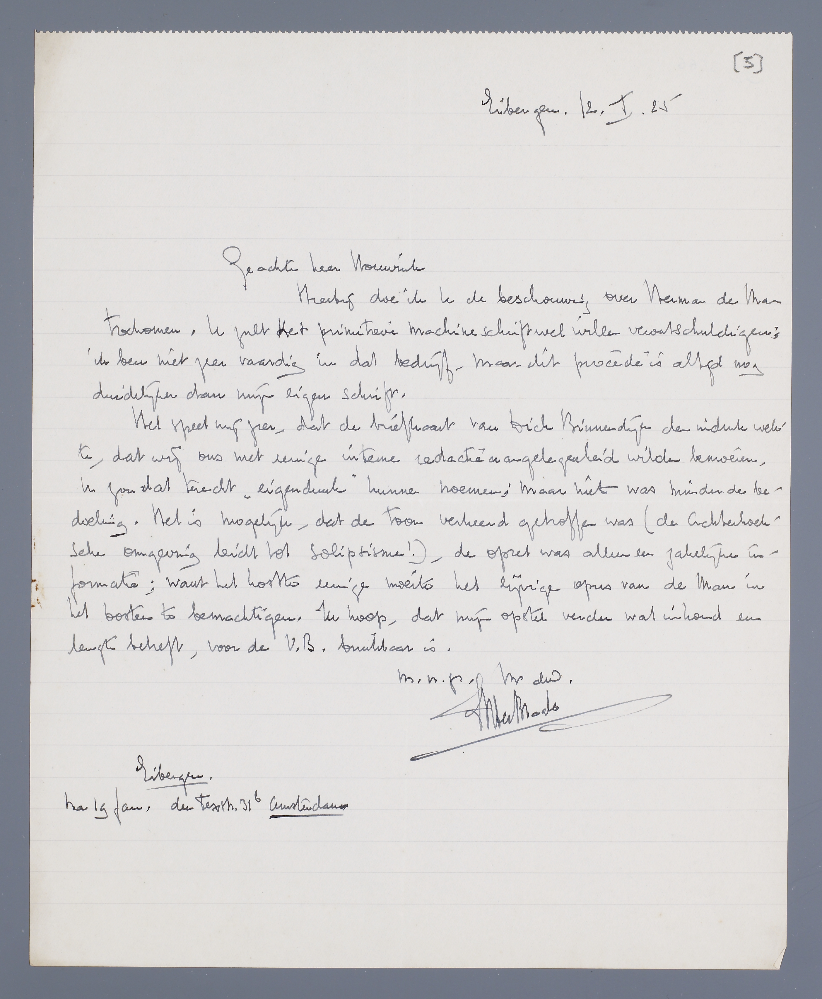 Hierbij doe ik U de beschouwing over Herman de Man toekomen. U zult het primitieve machineschrift wel willen verontschuldigen; ik ben niet zeer vaardig in dat bedrijf. Maar dit procédé is altijd nog duidelijker dan mijn eigen schrift.