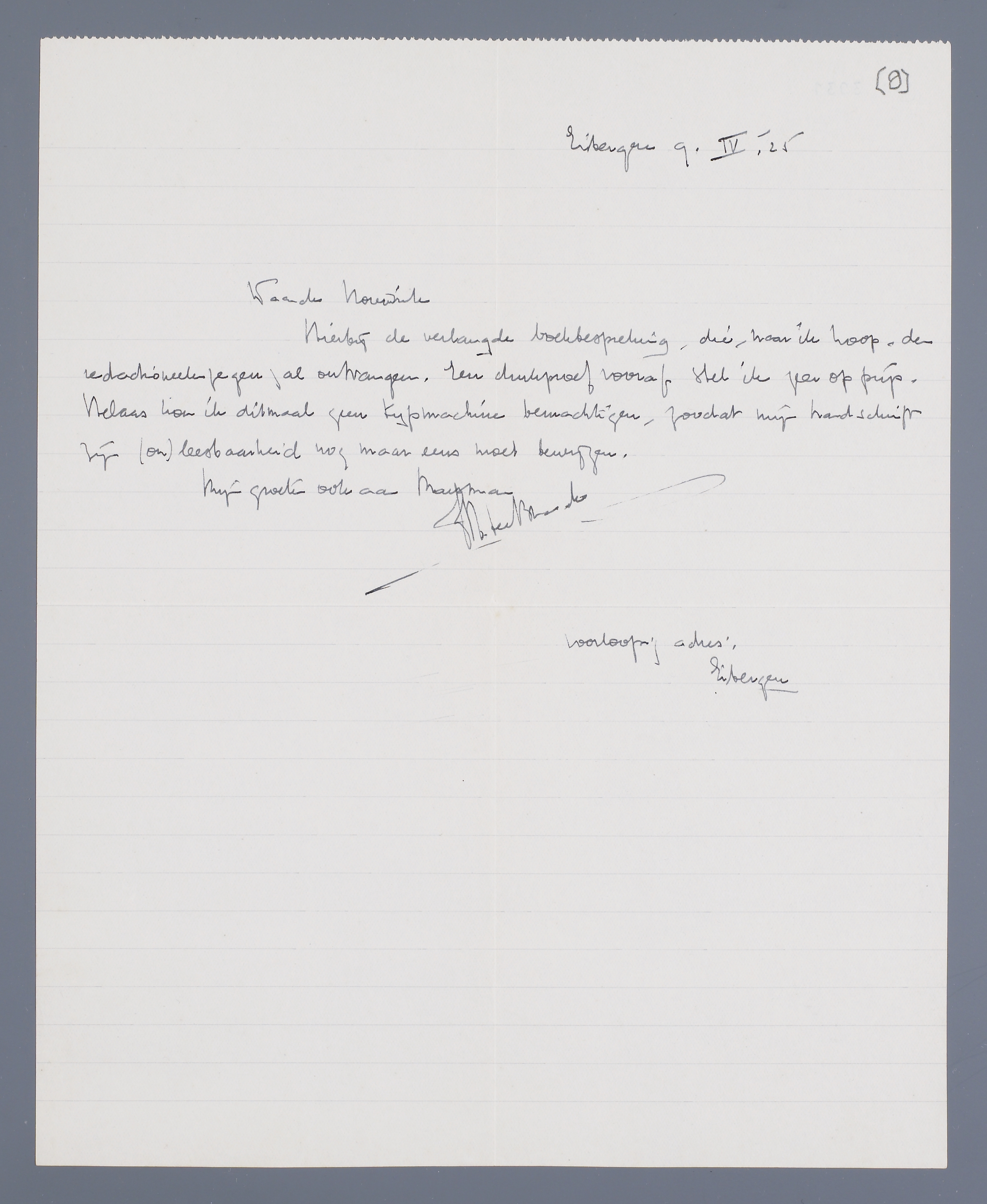 Hierbij de verlangde boekbespreking, die, naar ik hoop, den redactioneelen zegen zal ontvangen. Een drukproef vooraf stel ik zeer op prijs. Helaas kon ik ditmaal geen typmachine bemachtigen, zoodat mijn handschrift zijn (on)leesbaarheid nog maar eens moet bewijzen.