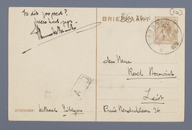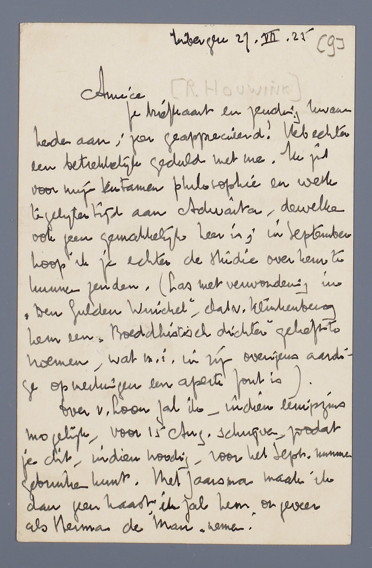 Je briefkaart en zending kwam heden aan; zeer geapprecieerd! Heb echter een betrekkelijk geduld met me. Ik zit voor mijn tentamen philosophie en werk tegelijkertijd aan Adwaita, dewelke ook geen gemakkelijk heer is; in September hoop ik je echter de studie over hem te kunnen zenden. (Las met verwondering in ‘Den Gulden Winckel’, dat v. Klinkenberg hem een ‘Boeddhistisch dichter’ gelieft te noemen, wat m.i. in zijn overigens aardige opmerkingen een aperte fout is).