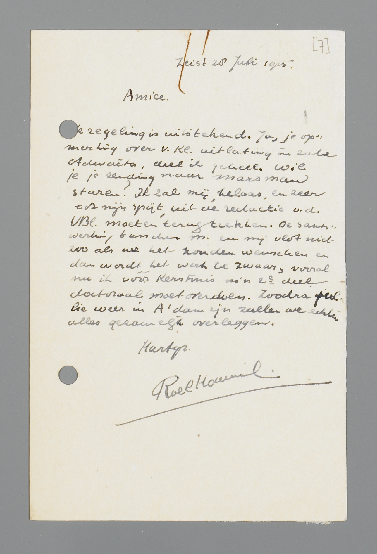 De regeling is uitstekend. Ja, je opmerking over v.Kl. uitlating in zake Adwaîta, deel ik geheel. Wil je je zending naar Marsman sturen? Ik zal mij, helaas, en zeer tot mijn spijt, uit de redactie v.d. VBl. moeten terugtrekken. De samenwerking tusschen M. en mij vlot niet zoo als we het zouden wenschen en dan wordt het werk te zwaar, vooral nu ik vóór Kerstmis m'n 2e deel doctoraal moet overdoen. Zoodra jullie weer in A'dam zijn zullen we echter alles gezamelijk overleggen.