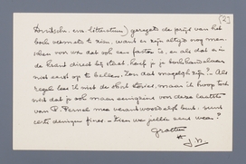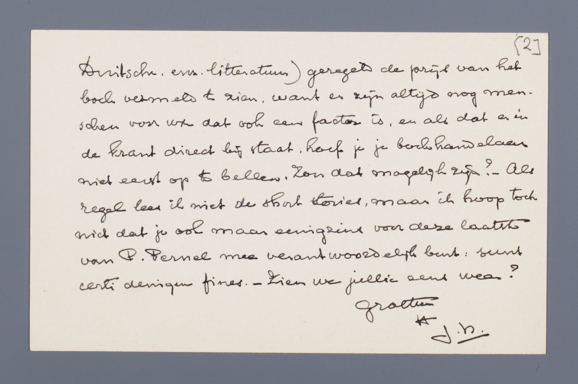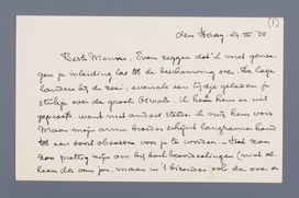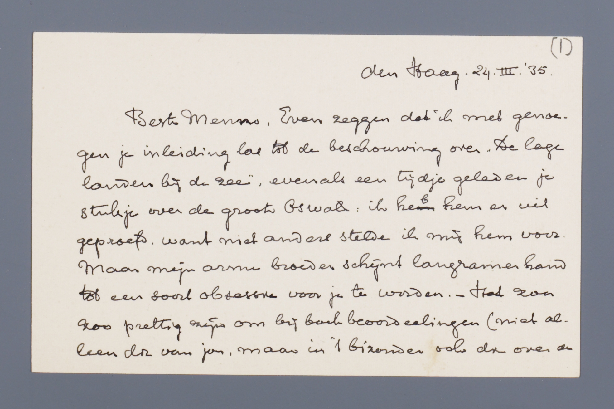 Beste Menno, Even zeggen dat ik met genoegen je inleiding las tot de beschouwing over ‘De lage landen bij de zee’, evenals een tijdje geleden je stukje over de groote Oswald: ik heb hem er uit geproefd, want niet anders stelde ik mij hem voor. Maar mijn arme broeder schijnt langzamerhand tot een soort obsessie voor je te worden. - Het zou prettig zijn om bij boek beoordeelingen (niet alleen die van jou, maar in het bizonder ook die over de Duitsche, enz. litteratuur) geregeld de prijs van het boek vermeld te zien, want er zijn altijd nog menschen voor wie dat ook een factor is, en als dat er in de krant direct bij staat, hoef je je boekhandelaar niet eerst op te bellen. Zou dat mogelijk zijn? - Als regel lees ik niet de short stories, maar ik hoop toch niet dat je ook maar eenigzins voor deze laatste van P. Pernel mee verantwoordelijk bent: sunt certi denique fines. - Zien we jullie eens weer?