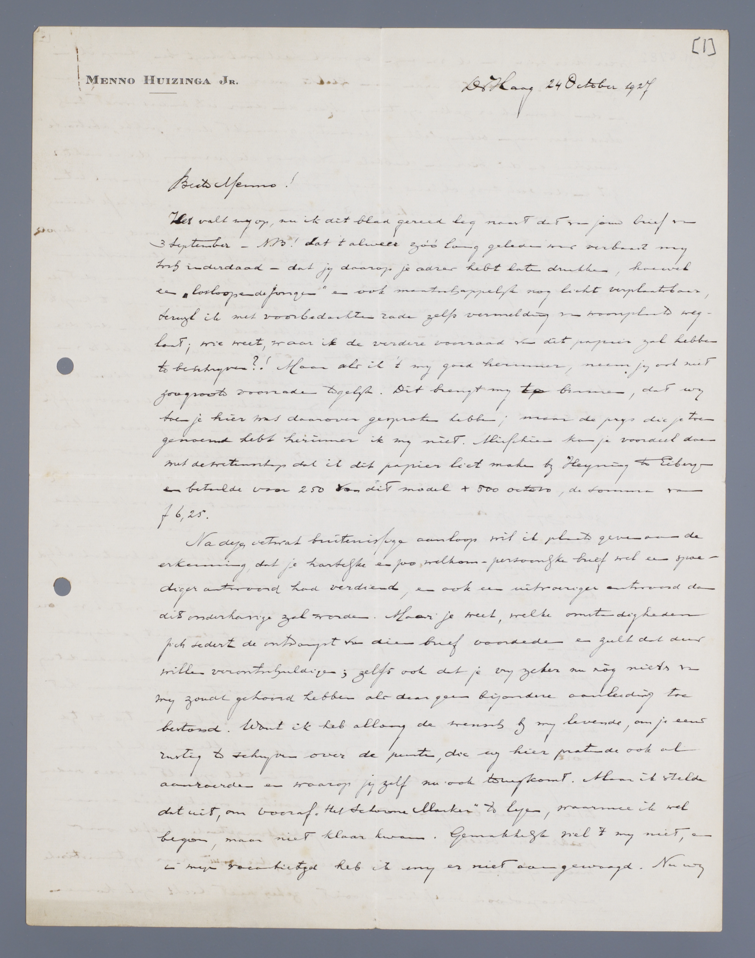 Het valt mij op, nu ik dit blad gereed leg naast dat van jouw brief van 3 September - N.B.! dat 't alweer zóó lang geleden was verbaast mij toch inderdaad - dat jij daarop je adres hebt laten drukken, hoewel een ‘losloopende jongen’ en ook maatschappelijk nog licht verplaatsbaar, terwijl ik met voorbedachten rade zelfs vermelding van woonplaats weglaat; wie weet, waar ik de verdere voorraad van dit papier zal hebben te beschrijven?! Maar als ik 't mij goed herinner, neem jij ook niet zoo groote voorraden tegelijk. Dit brengt mij te binnen, dat wij toen je hier was daarover gesproken hebben; maar de prijs die je toen genoemd hebt herinner ik mij niet. Misschien kan je voordeel doen met de wetenschap dat ik dit papier liet maken bij Heijning te Eibergen en betaalde voor 250 van dit model + 500 octavo, de somma van f6,25.