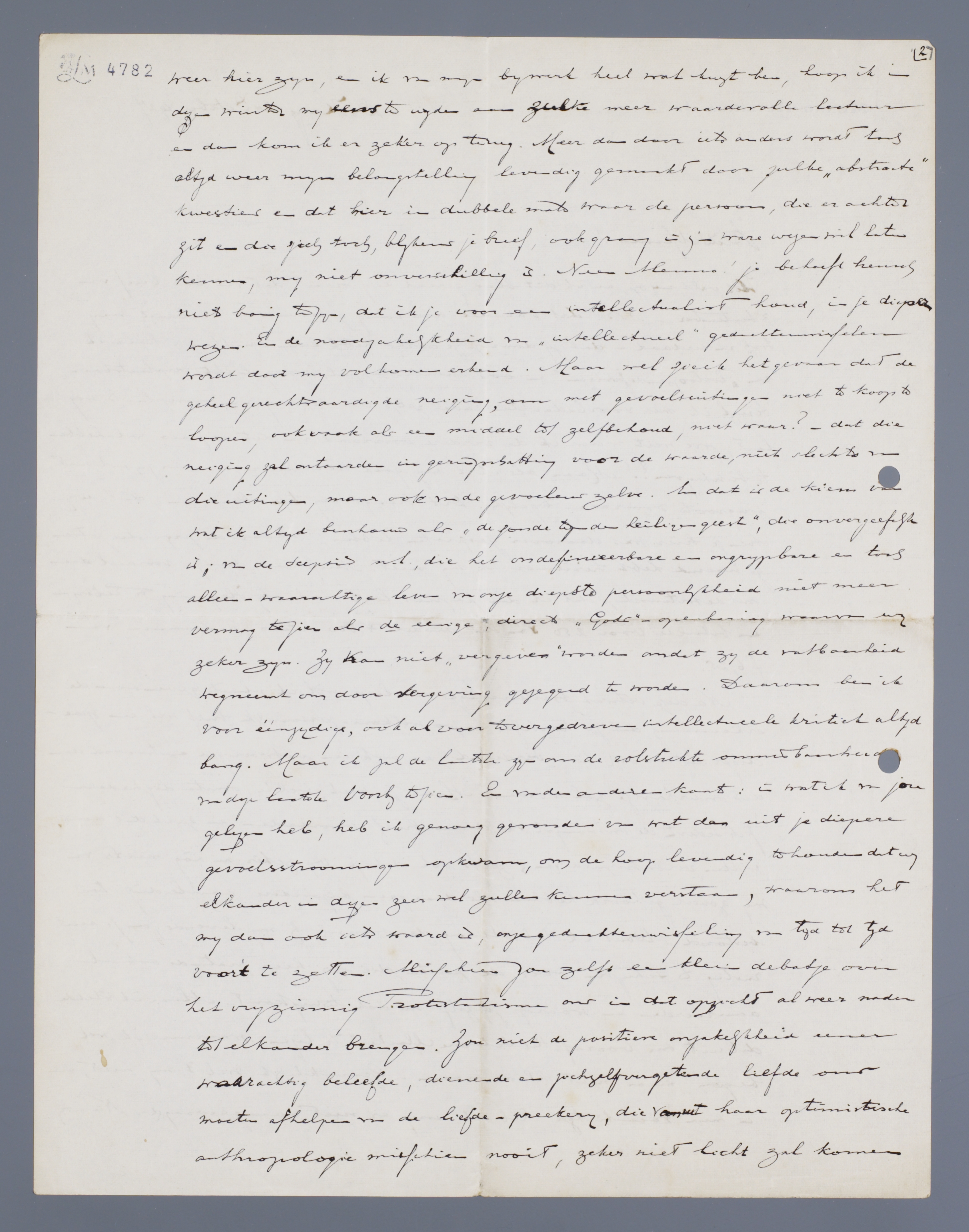 Na deze ietwat buitenissige aanloop wil ik plaats geven aan de erkenning, dat je hartelijke en zoo welkom-persoonlijke brief wel een spoediger antwoord had verdiend, en ook een uitvoeriger antwoord dan dit onderhavige zal worden. Maar je weet, welke omstandigheden zich sedert de ontvangst van dien brief voordeden en zult dat dus willen verontschuldigen; zelfs ook dat je vrij zeker nu nòg niets van mij zoudt gehoord hebben als daar geen bijzondere aanleiding toe bestond. Want ik heb allang de wensch bij mij levende, om je eens rustig te schrijven over de punten, die wij hier pratende ook al aanroerden en waarop jij zelf nu ook terugkomt. Maar ik stelde dat uit, om vooraf ‘Het Schoone Masker’ te lezen, waarmee ik wel begon, maar niet klaar kwam. Gemakkelijk viel 't mij niet, en in mijn vacantietijd heb ik mij er niet aan gewaagd. Nu wij weer hier zijn, en ik van mijn bijwerk heel wat kwijt ben, hoop ik in dezen winter mij eens te wijden aan zulke meer waardevolle lectuur en dan kom ik er zeker op terug. Meer dan door iets anders wordt toch altijd weer mijn belangstelling levendig gemaakt door zulke ‘abstracte’ kwesties en dat hier in dubbele mate waar de persoon, die er achter zit en die zich toch, blijkens je brief, ook graag in z'n ware wezen wil laten kennen, mij niet onverschillig is. Neen Menno! je behoeft heusch niet bang te zijn, dat ik je voor een intellectualist houd, in je diepste wezen. En de noodzakelijkheid van ‘intellectueel’ gedachtenwisselen wordt door mij volkomen erkend. Maar wel zie ik het gevaar dat de geheel gerechtvaardigde neiging, om met gevoelsuitingen niet te koop te loopen, ook vaak als een middel tot zelfbehoud, niet waar? - dat die neiging zal ontaarden in geringschatting voor de waarde, niet slechts van die uitingen, maar ook van de gevoelens zelve. En dat is de kiem van wat ik altijd beschouw als ‘de zonde tegen den heiligen geest’, die onvergeefelijk is; van de scepsis n.l., die het ondefinieerbare en ongrijpbare en toch alleen-waarachtige leven van onze diepste persoonlijkheid niet meer vermag te zien als de eenige directe ‘Gods’-openbaring waarvan wij zeker zijn. Zij kan niet ‘vergeven’ worden omdat zij de vatbaarheid wegneemt om door vergeving gezegend te worden. Daarom ben ik voor éénzijdige, ook al voor tevergedreven intellectueele kritiek altijd bang. Maar ik zal de laatste zijn om de volstrekte onmisbaarheid van deze laatste voorbij te zien. En van den anderen kant: in wat ik van jou gelezen heb, heb ik genoeg gevonden van wat dan uit je diepere gevoelsstroomingen opkwam, om de hoop levendig te houden dat wij elkander in dezen zeer wel zullen kunnen verstaan, waarom het mij dan ook iets waard is, onze gedachtenwisseling van tijd tot tijd voort te zetten. Misschien zou zelfs een klein debatje over het vrijzinnig Protestantisme ons in dat opzicht al weer nader tot elkander brengen. Zou niet de positieve onzakelijkheid eener waarachtig beleefde, dienende en zichzelfvergetende liefde ons moeten afhelpen van de liefde-preekerij, die vanuit haar optimistische anthropologie misschien nooit, zeker niet licht zal komen tot de juiste kennis van de eenige bron waaruit die liefde kan worden gevoed? Maar hoeveel zit, in al wat wij over deze dingen denken, van onze eigen psychische aanleg, waardoor tenslotte iedere mensch dat alles noodzakelijk alleen op z'n eigen manier kan bevatten?