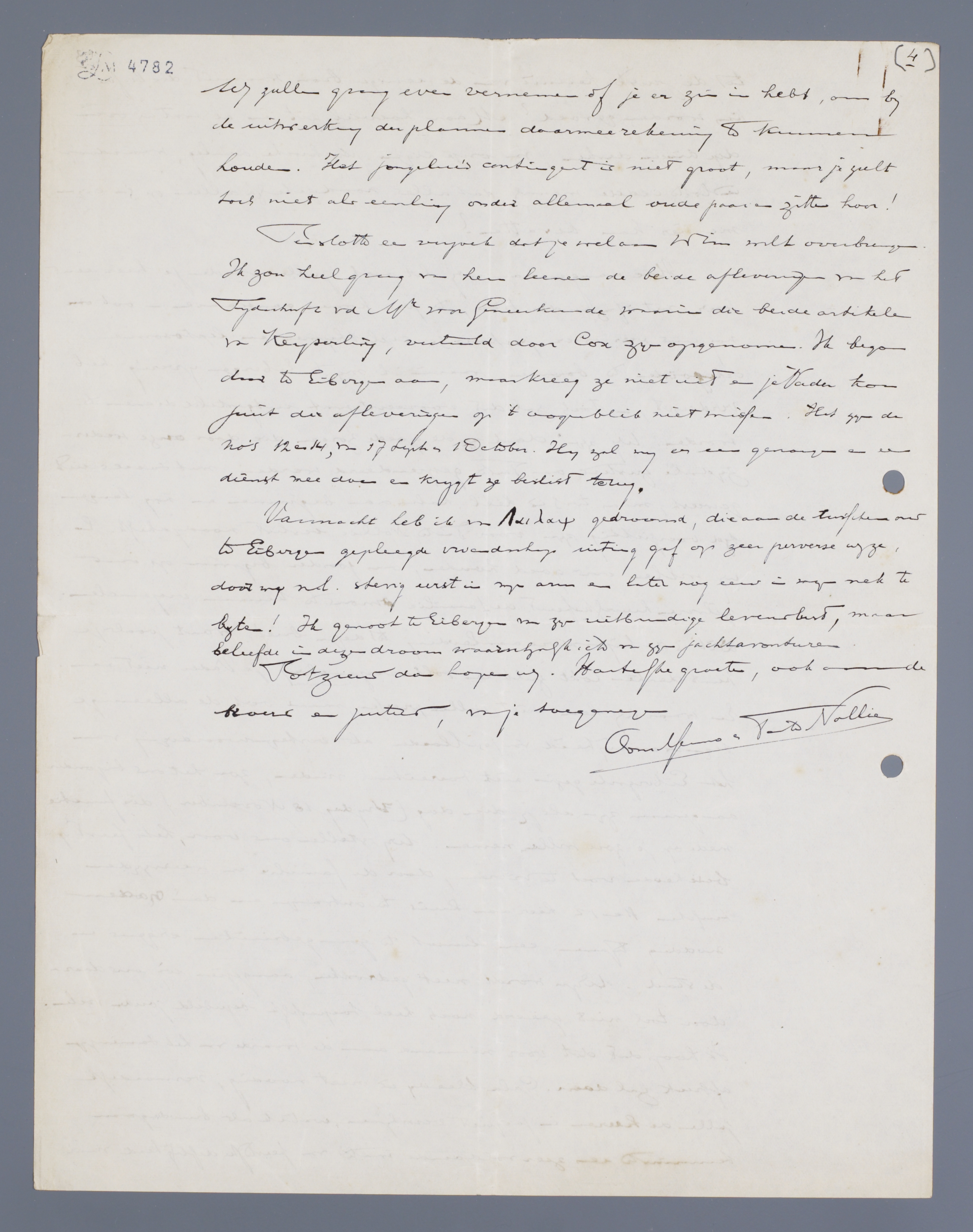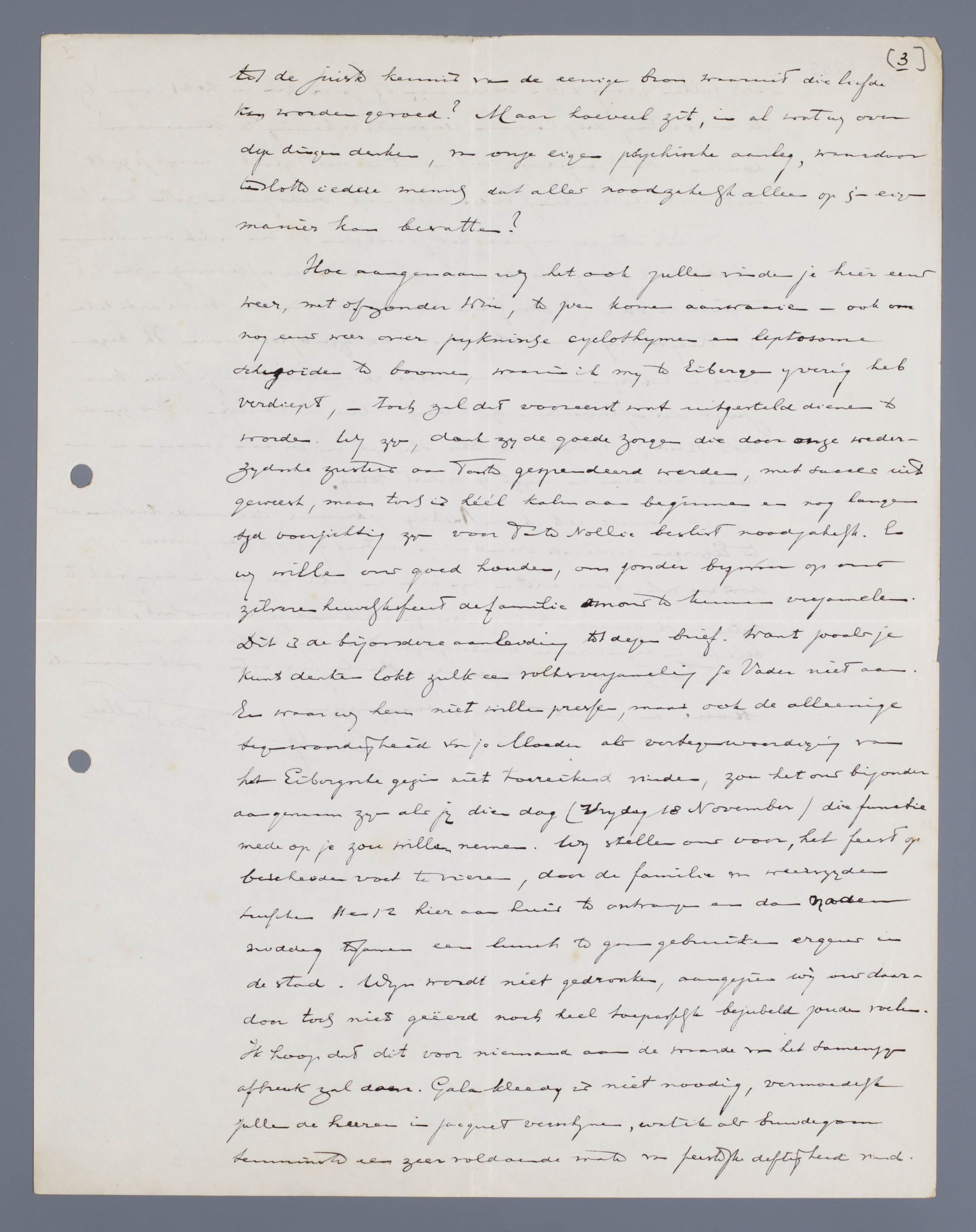 Hoe aangenaam wij het ook zullen vinden je hier eens weer, met of zonder Wim, te zien komen aanwaaien - ook om nog eens weer over pyknische cyclothymen en leptosome schizoïden te boomen, waarin ik mij te Eibergen ijverig heb verdiept, - toch zal dat vooreerst wat uitgesteld dienen te worden. Wij zijn, dank zij de goede zorgen die door onze wederzijdsche zusters aan Tante gespendeerd werden, met succes uit geweest, maar toch is héél kalm aan beginnen en nog langen tijd voorzichtig zijn voor Tante Nollie beslist noodzakelijk. En wij willen ons goed houden, ons zonder bezwaren op ons zilveren huwelijksfeest de familie om ons te kunnen verzamelen. Dit is de bijzondere aanleiding tot dezen brief. Want zooals je kunt denken lokt zulk een volksverzameling je Vader niet aan. En waar wij hem niet willen pressen, maar ook de alleenige tegenwoordigheid van je Moeder als vertegenwoordiging van het Eibergsche gezin niet toereikend vinden, zou het ons bijzonder aangenaam zijn als jij dien dag (Vrijdag 18 November) die functie mede op je zou willen nemen. Wij stellen ons voor, het feest op bescheiden voet te vieren, door de familie van weerszijden tusschen 11 en 12 hier aan huis te ontvangen en dan na den middag tesamen een lunch te gaan gebruiken ergens in de stad. Wijn wordt niet gedronken, aangezien wij ons daardoor toch niet geëerd noch heel toepasselijk bejubeld zouden voelen. Ik hoop dat dit voor niemand aan de waarde van het samenzijn afbreuk zal doen. Galakleeding is niet noodig, vermoedelijk zullen de heeren in jacquet verschijnen, wat ik als bruidegom tenminste een zeer voldoende mate van feestelijke deftigheid vind. Wij zullen graag even vernemen of je er zin in hebt, om bij de uitwerking der plannen daarmee rekening te kunnen houden. Het jongeluiscontingent is niet groot, maar je zult toch niet als eenling onder allemaal oude paaren zitten hoor!