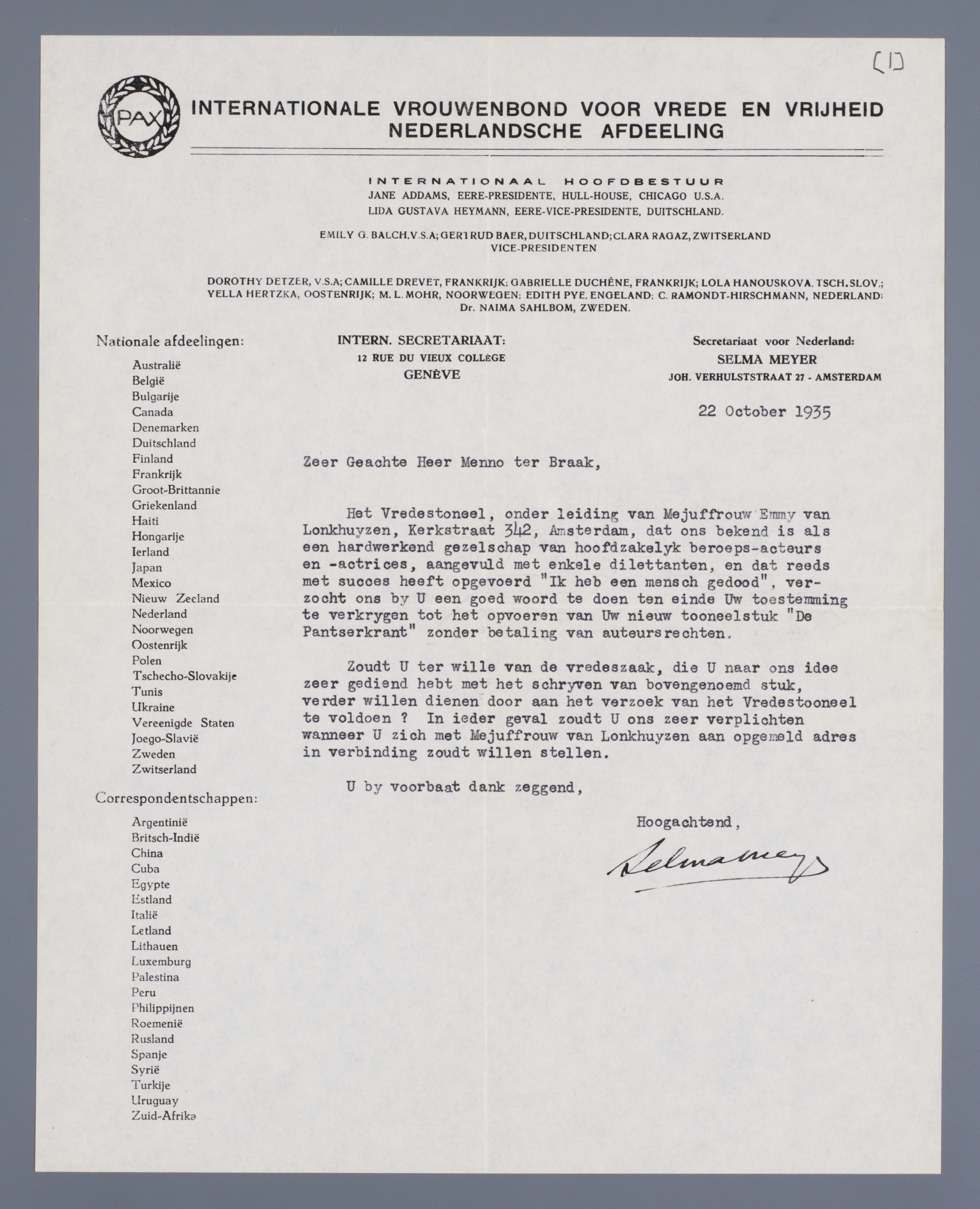 Briefwisseling Menno ter Braak - Internationale Vrouwenbond voor Vrede en Vrijheid, Nederlandsche Afdeeling