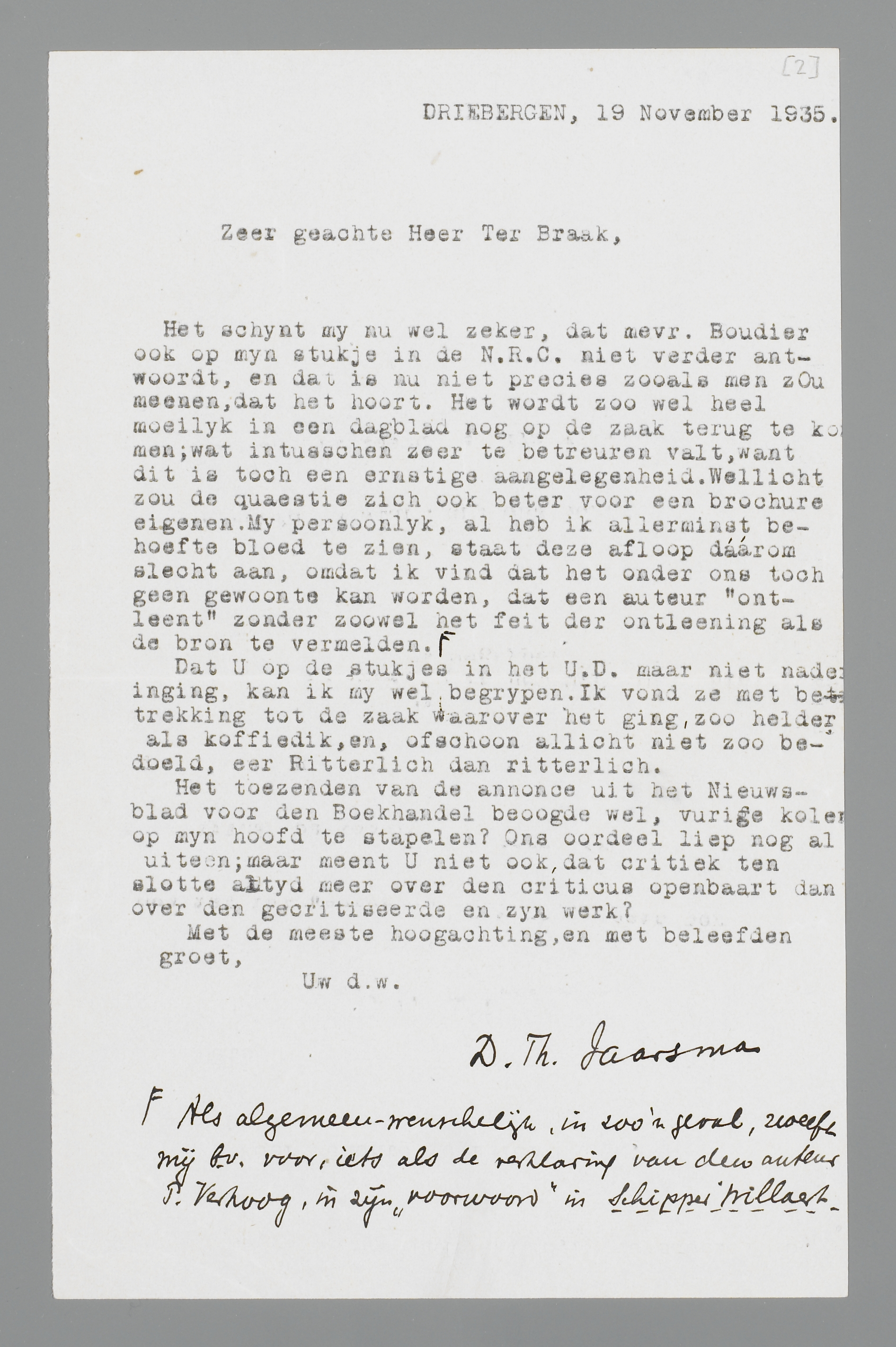Het schynt my nu wel zeker, dat mevr. Boudier ook op myn stukje in de N.R.C. niet verder antwoordt, en dat is nu niet precies zooals men zou meenen, dat het hoort. Het wordt zoo wel heel moeilyk in een dagblad nog op de zaak terug te komen; wat intusschen zeer te betreuren valt, want dit is toch een ernstige aangelegenheid. Wellicht zou de quaestie zich ook beter voor een brochure eigenen. My persoonlyk, al heb ik allerminst behoefte bloed te zien, staat deze afloop dáárom slecht aan, omdat ik vind dat het onder ons toch geen gewoonte kan worden, dat een auteur ‘ontleent’ zonder zoowel het feit der ontleening als de bron te vermelden. Als algemeen-menschelijk, in zoo'n geval, zweeft mij b.v. voor, iets als de verklaring van den auteur P.Verhoog, in zijn ‘voorwoord’ in Schippers Willaert.