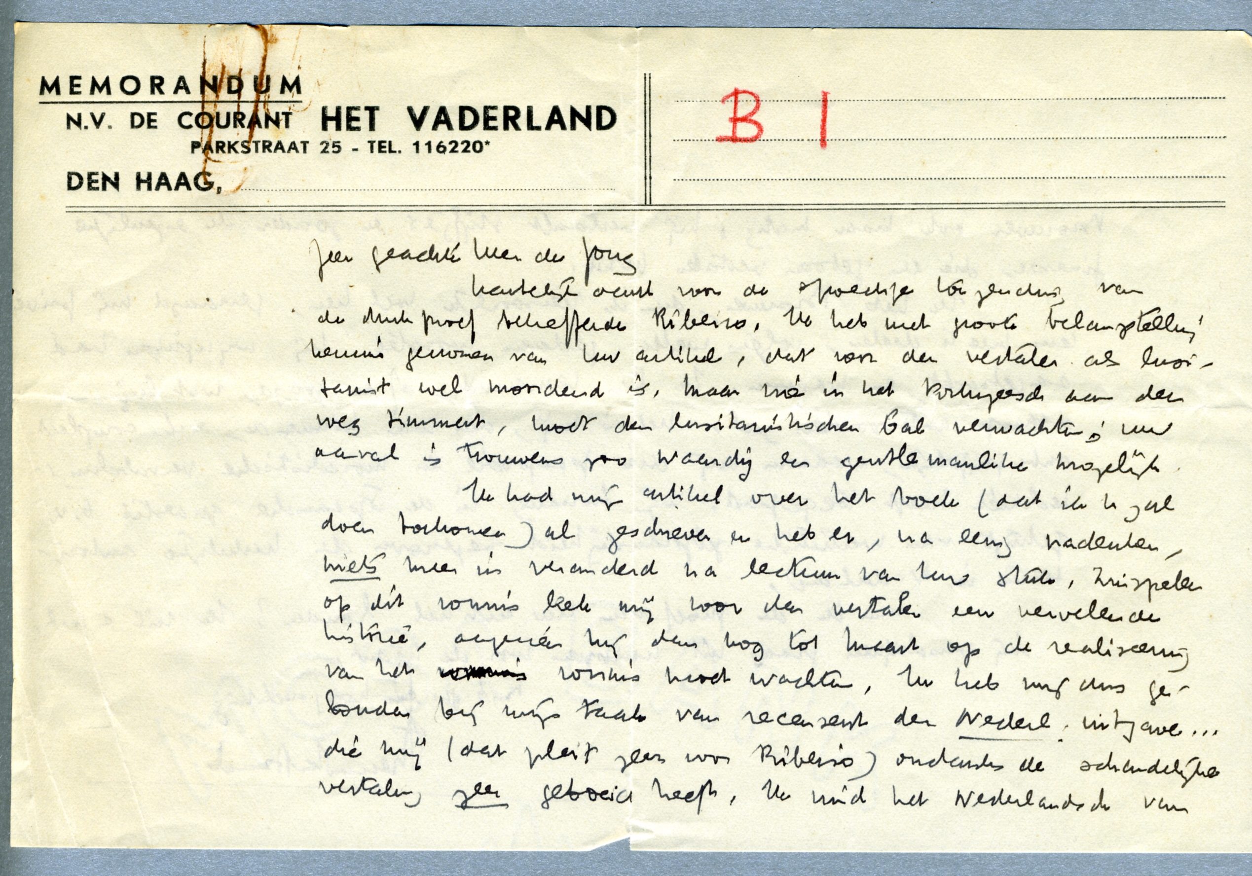 Ik had mijn artikel over het boek (dat ik U zal doen toekomen) al geschreven en heb er, na eenig nadenken, niets meer in veranderd na lectuur van Uw stuk, zinspelen op dit vonnis leek mij voor den vertaler een vervelende historie, aangezien hij dan nog tot maart op de realiseering van het vonnis moet wachten. Ik heb mij dus gehouden bij mijn taak van recensent der Nederl. uitgave - die mij (dat pleit zeer voor Ribeiro) ondanks de schandelijke vertaling zeer geboeid heeft, ik vind het Nederlandsch van Brouwer ook maar matig; hij vertaalt stijfjes en zonder de eigenlijke finesse, die een geboren vertaler bezit.