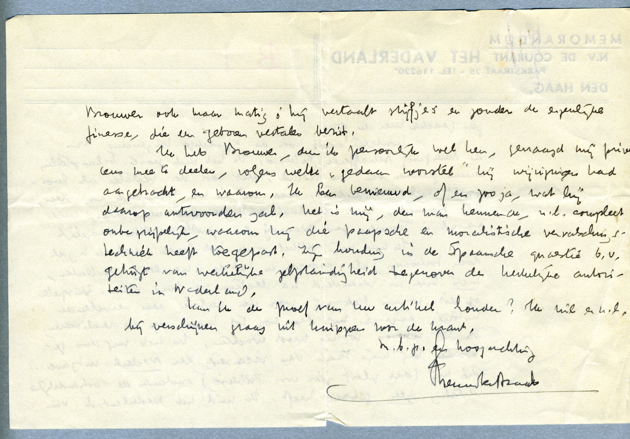 Ik heb Brouwer, die ik persoonlijk wel ken, gevraagd mij privé eens mee te deelen, volgens welk ‘gedaan voorstel’ hij wijzigingen had aangebracht, en waarom. Ik ben benieuwd, of en zoo ja, wat hij daarop antwoorden zal, het is mij, den man kennende, n.l. compleet onbegrijpelijk, waarom hij die paapsche en moralistische vervalschingstechniek heeft toegepast. Zijn houding in de Spaansche quaestie b.v. getuigt van werkelijke zelfstandigheid tegenover de kerkelijke autoriteiten in Nederland.
