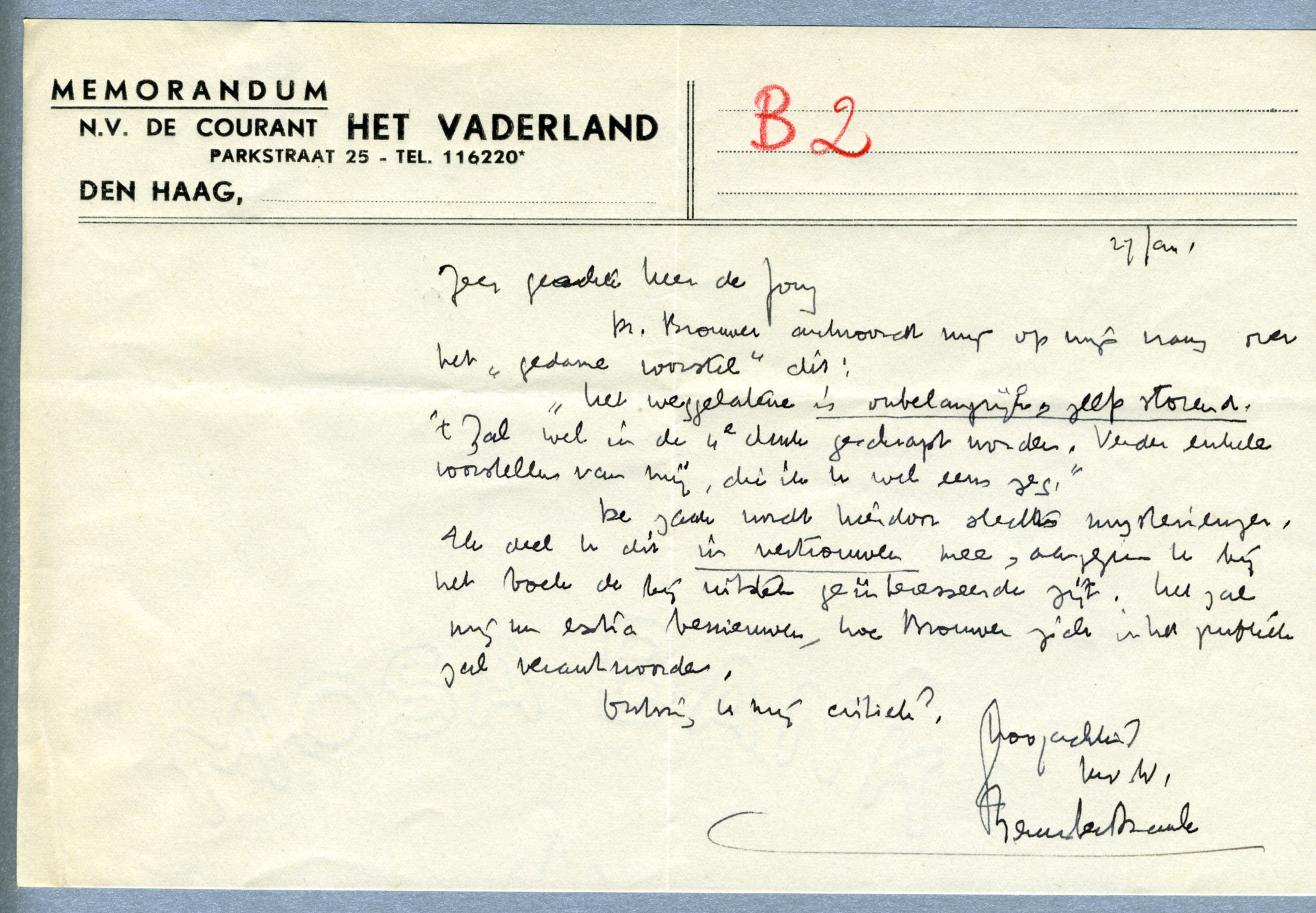 De zaak wordt hierdoor slechts mysterieuzer. U deel ik dit in vertrouwen mee, aangezien U bij het boek de bij uitstek geïnteresseerde zijt. Het zal mij nu extra benieuwen, hoe Brouwer zich in het publiek zal verantwoorden.